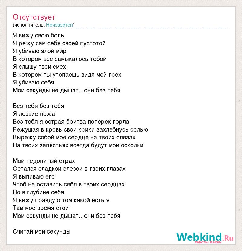 Я вижу свою боль Я режу сам себя своей пустотой Я убиваю злой мир В котором все замыкалось тобой Я слышу твой смех В котором ты утопаешь видя мой грех Я убиваю себя Мои секунды не дышат...они без тебя Без тебя без тебя Я лезвие ножа Без тебя я острая бритва поперек горла Режущая в кровь свои крики захлебнусь солью Вырежу собой мое сердце на твоих слезах На твоих запястьях всегда будут мои осколки Мой недопитый страх Остался сладкой слезой в твоих глазах Я выпиваю его Чтоб не оставить себя в твоих сердцах Но в глубине себя Я вижу правду о том какой есть я Там мое время стоит Мои секунды не дышат...они без тебя Считай мои секунды