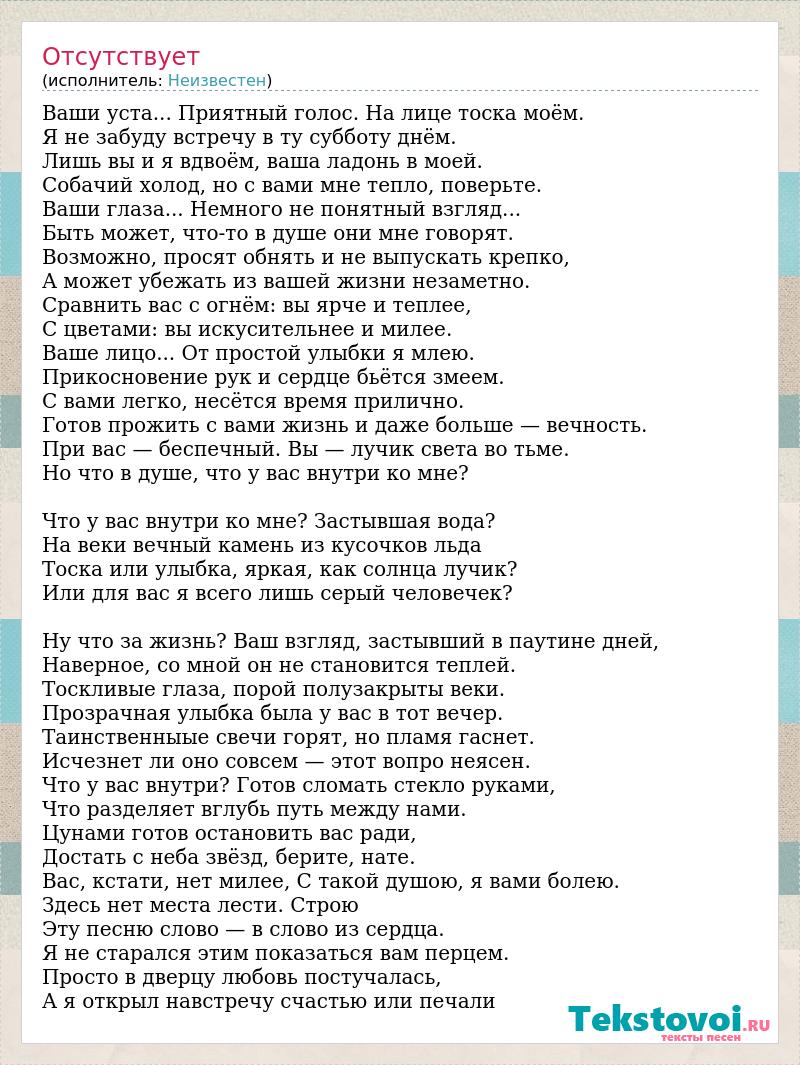 Ваши уста... Приятный голос. На лице тоска моём. Я не забуду встречу в ту субботу днём. Лишь вы и я вдвоём, ваша ладонь в моей. Собачий холод, но с вами мне тепло, поверьте. Ваши глаза... Немного не понятный взгляд... Быть может, что-то в душе они мне говорят. Возможно, просят обнять и не выпускать крепко, А может убежать из вашей жизни незаметно. Сравнить вас с огнём: вы ярче и теплее, С цветами: вы искусительнее и милее. Ваше лицо... От простой улыбки я млею. Прикосновение рук и сердце бьётся змеем. С вами легко, несётся время прилично. Готов прожить с вами жизнь и даже больше — вечность. При вас — беспечный. Вы — лучик света во тьме. Но что в душе, что у вас внутри ко мне? Что у вас внутри ко мне? Застывшая вода? На веки вечный камень из кусочков льда Тоска или улыбка, яркая, как солнца лучик? Или для вас я всего лишь серый человечек? Ну что за жизнь? Ваш взгляд, застывший в паутине дней, Наверное, со мной он не становится теплей. Тоскливые глаза, порой полузакрыты веки. Прозрачная улыбка была у вас в тот вечер. Таинственныые свечи горят, но пламя гаснет. Исчезнет ли оно совсем — этот вопро неясен. Что у вас внутри? Готов сломать стекло руками, Что разделяет вглубь путь между нами. Цунами готов остановить вас ради, Достать с неба звёзд, берите, нате. Вас, кстати, нет милее, С такой душою, я вами болею. Здесь нет места лести. Строю Эту песню слово — в слово из сердца. Я не старался этим показаться вам перцем. Просто в дверцу любовь постучалась, А я открыл навстречу счастью или печали