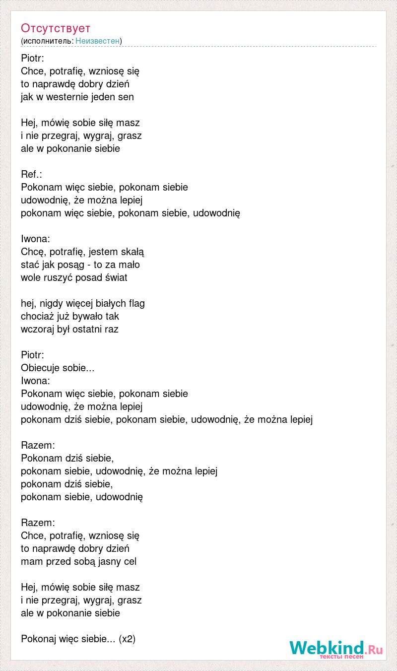 Piotr: Chce, potrafię, wzniosę się to naprawdę dobry dzień jak w westernie jeden sen Hej, mówię sobie siłę masz i nie przegraj, wygraj, grasz ale w pokonanie siebie Ref.: Pokonam więc siebie, pokonam siebie udowodnię, że można lepiej pokonam więc siebie, pokonam siebie, udowodnię Iwona: Chcę, potrafię, jestem skałą stać jak posąg - to za mało [bad word] #263; posad świat hej, nigdy więcej białych flag chociaż już bywało tak wczoraj był ostatni raz Piotr: Obiecuje sobie... Iwona: Pokonam więc siebie, pokonam siebie udowodnię, że można lepiej pokonam dziś siebie, pokonam siebie, udowodnię, że można lepiej Razem: Pokonam dziś siebie, pokonam siebie, udowodnię, że można lepiej pokonam dziś siebie, pokonam siebie, udowodnię Razem: Chce, potrafię, wzniosę się to naprawdę dobry dzień mam przed sobą jasny cel Hej, mówię sobie siłę masz i nie przegraj, wygraj, grasz ale w pokonanie siebie Pokonaj więc siebie... (x2)