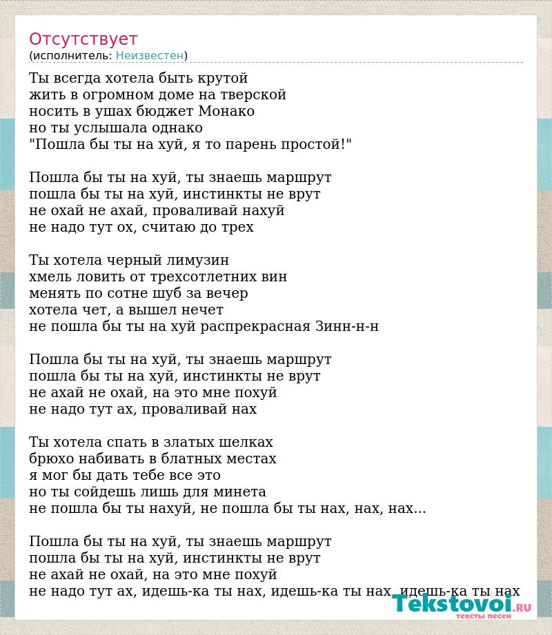 Ты всегда хотела быть крутой жить в огромном доме на тверской носить в ушах бюджет Монако но ты услышала однако "Пошла бы ты на хуй, я то парень простой!" Пошла бы ты на хуй, ты знаешь маршрут пошла бы ты на хуй, инстинкты не врут не охай не ахай, проваливай нахуй не надо тут ох, считаю до трех Ты хотела черный лимузин хмель ловить от трехсотлетних вин менять по сотне шуб за вечер хотела чет, а вышел нечет не пошла бы ты на хуй распрекрасная Зинн-н-н Пошла бы ты на хуй, ты знаешь маршрут пошла бы ты на хуй, инстинкты не врут не ахай не охай, на это мне похуй не надо тут ах, проваливай нах Ты хотела спать в златых шелках брюхо набивать в блатных местах я мог бы дать тебе все это но ты сойдешь лишь для минета не пошла бы ты нахуй, не пошла бы ты нах, нах, нах... Пошла бы ты на хуй, ты знаешь маршрут пошла бы ты на хуй, инстинкты не врут не ахай не охай, на это мне похуй не надо тут ах, идешь-ка ты нах, идешь-ка ты нах, идешь-ка ты нах