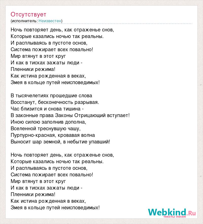 Ночь повторяет день, как отраженье снов, Которые казались ночью так реальны. И расплываясь в пустоте основ, Система пожирает всех повально! Мир втянут в этот круг И как в тисках зажаты люди - Пленники режима! Как истина рожденная в веках, Змея в кольце путей неисповедимых! В тысячелетиях прошедшие слова Восстанут, бесконечность разрывая. Час близится и снова тишина - В законные права Законы Отрицающий вступает! Иною силою заполнив дополна, Вселенной треснувшую чашу, Пурпурно-красная, кровавая волна Выносит шар земной, в небытие упавший! Ночь повторяет день, как отраженье снов, Которые казались ночью так реальны. И расплываясь в пустоте основ, Система пожирает всех повально! Мир втянут в этот круг И как в тисках зажаты люди - Пленники режима! Как истина рожденная в веках, Змея в кольце путей неисповедимых!