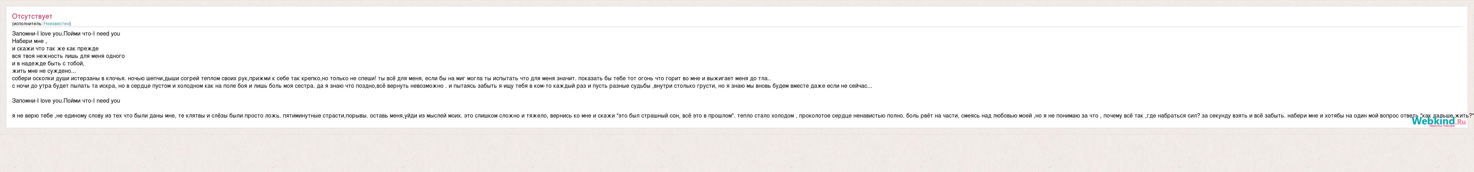 Запомни-I love you.Пойми что-I need you Набери мне , и скажи что так же как прежде вся твоя нежность лишь для меня одного и в надежде быть с тобой, жить мне не суждено... собери осколки души истерзаны в клочья. ночью шепчи,дыши согрей теплом своих рук,прижми к себе так крепко,но только не спеши! ты всё для меня, если бы на миг могла ты испытать что для меня значит. показать бы тебе тот огонь что горит во мне и выжигает меня до тла.. с ночи до утра будет пылать та искра, но в сердце пустом и холодном как на поле боя и лишь боль моя сестра. да я знаю что поздно,всё вернуть невозможно . и пытаясь забыть я ищу тебя в ком-то каждый раз и пусть разные судьбы ,внутри столько грусти, но я знаю мы вновь будем вместе даже если не сейчас... Запомни-I love you.Пойми что-I need you я не верю тебе ,не единому слову из тех что были даны мне, те клятвы и слёзы были просто ложь. пятиминутные страсти,порывы. оставь меня,уйди из мыслей моих. это слишком сложно и тяжело, вернись ко мне и скажи "это был страшный сон, всё это в прошлом". тепло стало холодом , проколотое сердце ненавистью полно. боль рвёт на части, смеясь над любовью моей ,но я не понимаю за что , почему всё так ,где набраться сил? за секунду взять и всё забыть. набери мне и хотябы на один мой вопрос ответь "как дальше жить?"