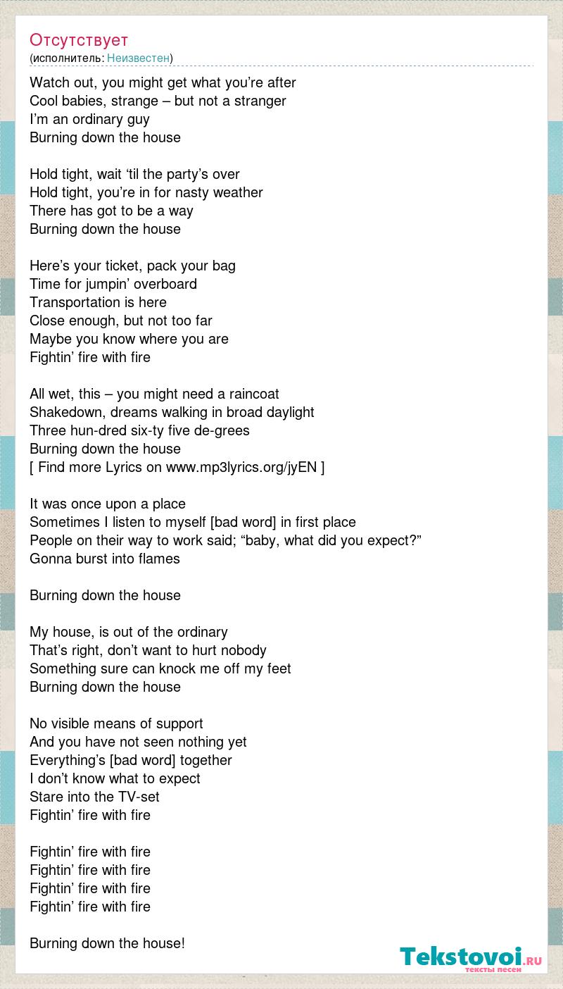 Watch out, you might get what you’re after Cool babies, strange – but not a stranger I’m an ordinary guy Burning down the house Hold tight, wait ‘til the party’s over Hold tight, you’re in for nasty weather There has got to be a way Burning down the house Here’s your ticket, pack your bag Time for jumpin’ overboard Transportation is here Close enough, but not too far Maybe you know where you are Fightin’ fire with fire All wet, this – you might need a raincoat Shakedown, dreams walking in broad daylight Three hun-dred six-ty five de-grees Burning down the house [ Find more Lyrics on www.mp3lyrics.org/jyEN ] It was once upon a place Sometimes I listen to myself [bad word] in first place People on their way to work said; “baby, what did you expect?” Gonna burst into flames Burning down the house My house, is out of the ordinary That’s right, don’t want to hurt nobody Something sure can knock me off my feet Burning down the house No visible means of support And you have not seen nothing yet Everything’s [bad word] together I don’t know what to expect Stare into the TV-set Fightin’ fire with fire Fightin’ fire with fire Fightin’ fire with fire Fightin’ fire with fire Fightin’ fire with fire Burning down the house!