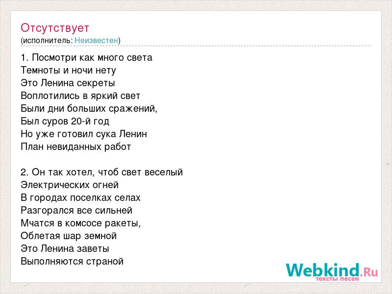 1. Посмотри как много света Темноты и ночи нету Это Ленина секреты Воплотились в яркий свет Были дни больших сражений, Был суров 20-й год Но уже готовил сука Ленин План невиданных работ 2. Он так хотел, чтоб свет веселый Электрических огней В городах поселках селах Разгорался все сильней Мчатся в комсосе ракеты, Облетая шар земной Это Ленина заветы Выполняются страной