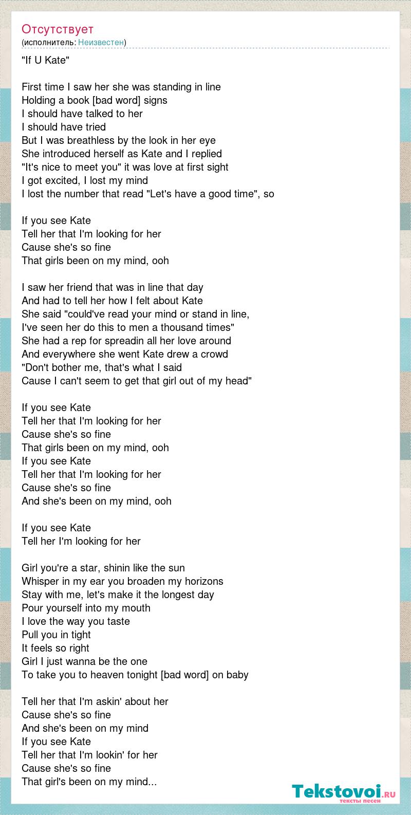 "If U Kate" First time I saw her she was standing in line Holding a book [bad word] signs I should have talked to her I should have tried But I was breathless by the look in her eye She introduced herself as Kate and I replied "It's nice to meet you" it was love at first sight I got excited, I lost my mind I lost the number that read "Let's have a good time", so If you see Kate Tell her that I'm looking for her Cause she's so fine That girls been on my mind, ooh I saw her friend that was in line that day And had to tell her how I felt about Kate She said "could've read your mind or stand in line, I've seen her do this to men a thousand times" She had a rep for spreadin all her love around And everywhere she went Kate drew a crowd "Don't bother me, that's what I said Cause I can't seem to get that girl out of my head" If you see Kate Tell her that I'm looking for her Cause she's so fine That girls been on my mind, ooh If you see Kate Tell her that I'm looking for her Cause she's so fine And she's been on my mind, ooh If you see Kate Tell her I'm looking for her Girl you're a star, shinin like the sun Whisper in my ear you broaden my horizons Stay with me, let's make it the longest day Pour yourself into my mouth I love the way you taste Pull you in tight It feels so right Girl I just wanna be the one To take you to heaven tonight [bad word] on baby Tell her that I'm askin' about her Cause she's so fine And she's been on my mind If you see Kate Tell her that I'm lookin' for her Cause she's so fine That girl's been on my mind...