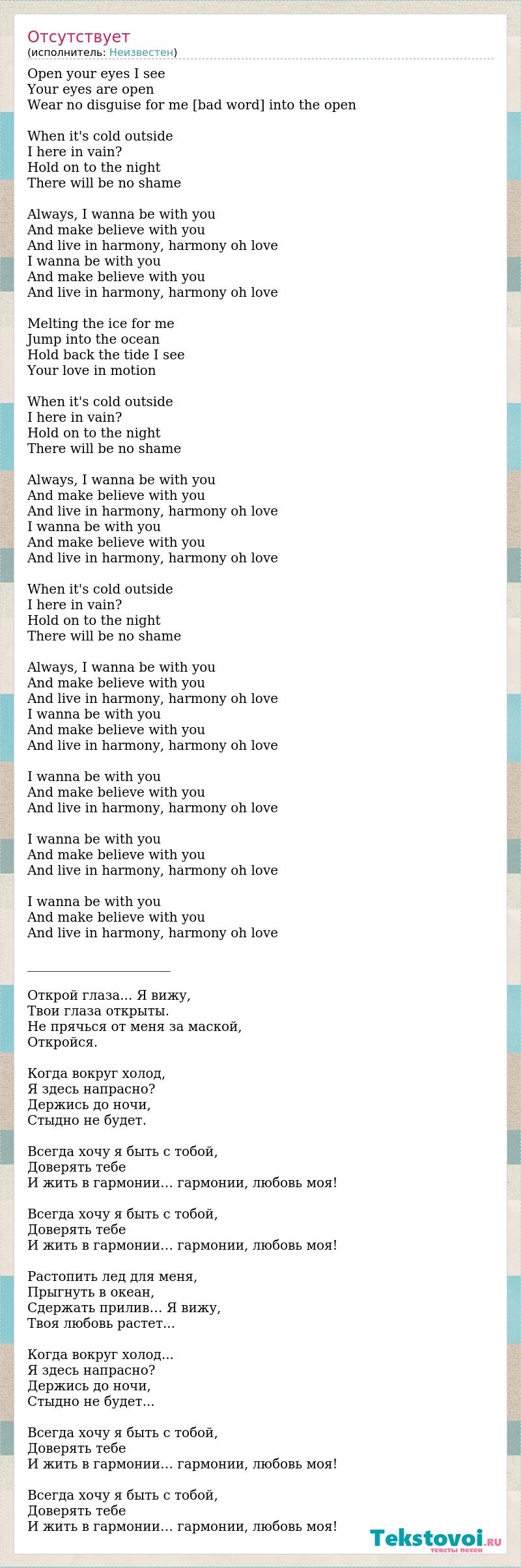 Open your eyes I see Your eyes are open Wear no disguise for me [bad word] into the open When it's cold outside I here in vain? Hold on to the night There will be no shame Always, I wanna be with you And make believe with you And live in harmony, harmony oh love I wanna be with you And make believe with you And live in harmony, harmony oh love Melting the ice for me Jump into the ocean Hold back the tide I see Your love in motion When it's cold outside I here in vain? Hold on to the night There will be no shame Always, I wanna be with you And make believe with you And live in harmony, harmony oh love I wanna be with you And make believe with you And live in harmony, harmony oh love When it's cold outside I here in vain? Hold on to the night There will be no shame Always, I wanna be with you And make believe with you And live in harmony, harmony oh love I wanna be with you And make believe with you And live in harmony, harmony oh love I wanna be with you And make believe with you And live in harmony, harmony oh love I wanna be with you And make believe with you And live in harmony, harmony oh love I wanna be with you And make believe with you And live in harmony, harmony oh love ______________________ Открой глаза... Я вижу, Твои глаза открыты. Не прячься от меня за маской, Откройся. Когда вокруг холод, Я здесь напрасно? Держись до ночи, Стыдно не будет. Всегда хочу я быть с тобой, Доверять тебе И жить в гармонии… гармонии, любовь моя! Всегда хочу я быть с тобой, Доверять тебе И жить в гармонии… гармонии, любовь моя! Растопить лед для меня, Прыгнуть в океан, Сдержать прилив… Я вижу, Твоя любовь растет... Когда вокруг холод... Я здесь напрасно? Держись до ночи, Стыдно не будет... Всегда хочу я быть с тобой, Доверять тебе И жить в гармонии… гармонии, любовь моя! Всегда хочу я быть с тобой, Доверять тебе И жить в гармонии… гармонии, любовь моя!