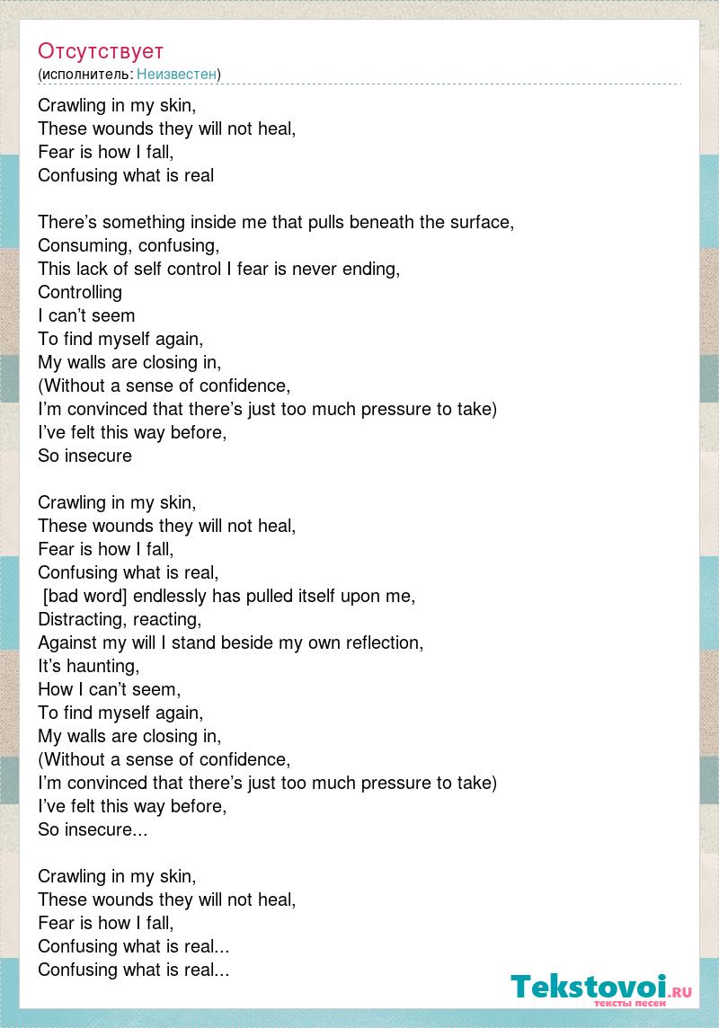 Crawling in my skin, These wounds they will not heal, Fear is how I fall, Confusing what is real There’s something inside me that pulls beneath the surface, Consuming, confusing, This lack of self control I fear is never ending, Controlling I can’t seem To find myself again, My walls are closing in, (Without a sense of confidence, I’m convinced that there’s just too much pressure to take) I’ve felt this way before, So insecure Crawling in my skin, These wounds they will not heal, Fear is how I fall, Confusing what is real, [bad word] endlessly has pulled itself upon me, Distracting, reacting, Against my will I stand beside my own reflection, It’s haunting, How I can’t seem, To find myself again, My walls are closing in, (Without a sense of confidence, I’m convinced that there’s just too much pressure to take) I’ve felt this way before, So insecure... Crawling in my skin, These wounds they will not heal, Fear is how I fall, Confusing what is real... Confusing what is real...