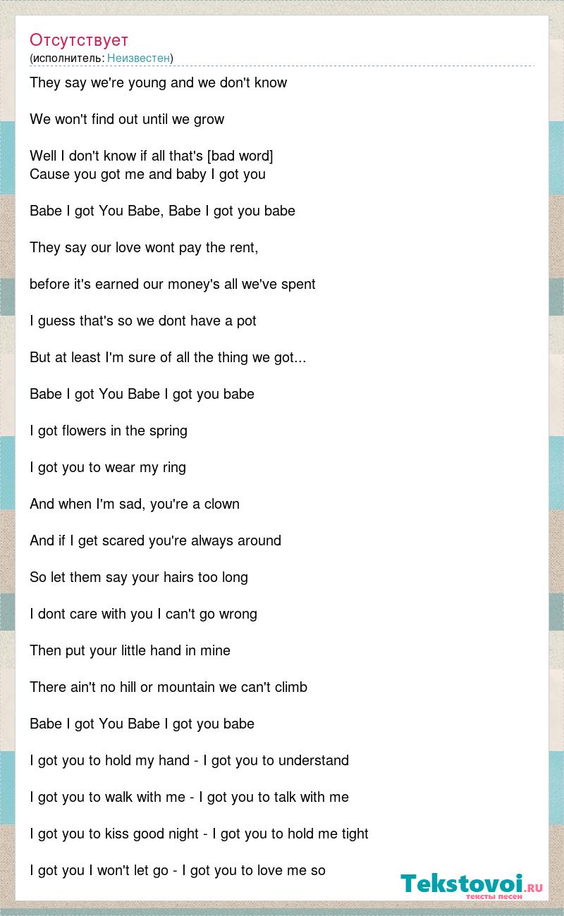 They say we're young and we don't know We won't find out until we grow Well I don't know if all that's [bad word] Cause you got me and baby I got you Babe I got You Babe, Babe I got you babe They say our love wont pay the rent, before it's earned our money's all we've spent I guess that's so we dont have a pot But at least I'm sure of all the thing we got... Babe I got You Babe I got you babe I got flowers in the spring I got you to wear my ring And when I'm sad, you're a clown And if I get scared you're always around So let them say your hairs too long I dont care with you I can't go wrong Then put your little hand in mine There ain't no hill or mountain we can't climb Babe I got You Babe I got you babe I got you to hold my hand - I got you to understand I got you to walk with me - I got you to talk with me I got you to kiss good night - I got you to hold me tight I got you I won't let go - I got you to love me so