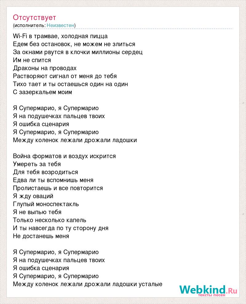 Wi-Fi в трамвае, холодная пицца Едем без остановок, не можем не злиться За окнами рвутся в клочки миллионы сердец Им не спится Драконы на проводах Растворяют сигнал от меня до тебя Тихо тает и ты остаешься один на один С зазеркальем моим Я Супермарио, я Супермарио Я на подушечках пальцев твоих Я ошибка сценария Я Супермарио, я Супермарио Между коленок лежали дрожали ладошки Война форматов и воздух искрится Умереть за тебя Для тебя возродиться Едва ли ты вспомнишь меня Пролистаешь и все повторится Я жду оваций Глупый моноспектакль Я не выпью тебя Только несколько капель И ты навсегда по ту сторону дня Не достанешь меня Я Супермарио, я Супермарио Я на подушечках пальцев твоих Я ошибка сценария Я Супермарио, я Супермарио Между коленок лежали дрожали ладошки усталые