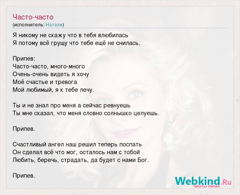 Я никому не скажу что в тебя влюбилась Я потому всё грущу что тебе ещё не снилась. Припев: Часто-часто, много-много Очень-очень видеть я хочу Моё счастье и тревога Мой любимый, я к тебе лечу. Ты и не знал про меня а сейчас ревнуешь Ты мне сказал, что меня словно солнышко целуешь. Припев. Счастливый ангел наш решил теперь поспать Он сделал всё что мог, осталось нам с тобой Любить, беречь, страдать, да будет с нами Бог. Припев.