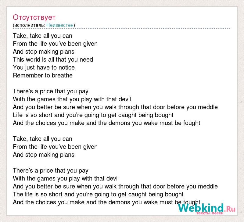 Take, take all you can From the life you’ve been given And stop making plans This world is all that you need You just have to notice Remember to breathe There’s a price that you pay With the games that you play with that devil And you better be sure when you walk through that door before you meddle Life is so short and you’re going to get caught being bought And the choices you make and the demons you wake must be fought Take, take all you can From the life you’ve been given And stop making plans There’s a price that you pay With the games you play with that devil And you better be sure when you walk through that door before you meddle The life is so short and you’re going to get caught being bought And the choices you make and the demons you wake must be fought