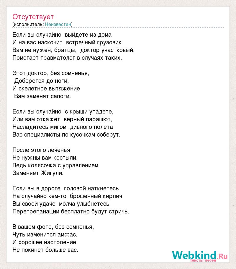 Если вы случайно выйдете из дома И на вас наскочит встречный грузовик Вам не нужен, братцы, доктор участковый, Помогает травматолог в случаях таких. Этот доктор, без сомненья, Доберется до ноги, И скелетное вытяжение Вам заменят сапоги. Если вы случайно с крыши упадете, Или вам откажет верный парашют, Насладитесь мигом дивного полета Вас специалисты по кусочкам соберут. После этого леченья Не нужны вам костыли. Ведь колясочка с управлением Заменяет Жигули. Если вы в дороге головой наткнетесь На случайно кем-то брошенный кирпич Вы своей удаче молча улыбнетесь Перетрепанации бесплатно будут стричь. В вашем фото, без сомненья, Чуть изменится амфас. И хорошее настроение Не покинет больше вас.