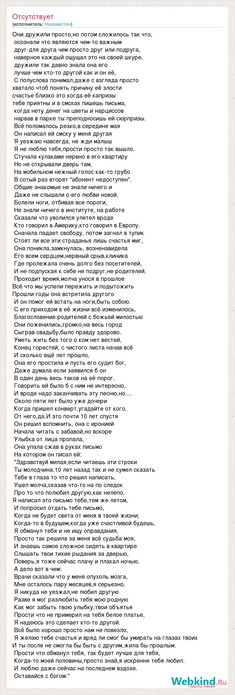 Они дружили просто,но потом сложилось так что, осознали что являются чем-то важным друг-для друга чем просто друг или подруга, наверное каждый ощущал это на своей шкуре, дружили так давно знала она его лучше чем кто-то другой как и он её, С полуслова понимал,даже с взгляда просто хватало чтоб понять причину её злости счастье близко это когда её капризы тебе приятны и в смсках пишешь письма, когда нету денег на цветы и нарциссов нарвав в парке ты преподносишь ей сюрпризы. Всё поломалось резко,в середине мая Он написал ей смску у меня другая Я уезжаю навсегда, не жди малыш Я не люблю тебя,прости просто так вышло. Стучала кулаками нервно в его квартиру Но не открывали дверь там, На мобильном нежный голос как-то грубо В сотый раз вторят "абонент недоступен". Общие знакомые не знали ничего и Даже не слышали о его любви новой, Болели ноги, отбивая все пороги, Не знали ничего в институте, на работе Сказали что уволился улетел вроде Кто говорил в Америку,кто говорил в Европу. Сначала падает свободу, потом загнал в тупик Стоят ли все эти страданья лишь счастья миг, Она поникла,замкнулась, возненавидела Его всем сердцем,нервный срыв,клиника Где пролежала очень долго без посетителей, И не подпуская к себе не подруг,не родителей. Проходит время,молча унося в прошлое Всё что мы успели пережить и подытожить Прошли годы она встретила другого И он помог ей встать на ноги,быть собою. С его приходом в её жизни всё изменилось, Благословение родителей с божьей милостью Они поженились,громко,на весь город Сыграв свадьбу,было правду здорово. Уметь жить без того о ком нет вестей, Конец горестей, с чистого листа начав всё И сколько ещё лет прошло, Она его простила и пусть его судит бог, Даже думала если заявился б он В один день весь таков на её порог. Говорить ей было б с ним не интересно, И вроде надо заканчивать эту песню,но.... Около пяти лет было уже дочери Когда пришел конверт,угадайте от кого, От него,да.И это почти 10 лет спустя Он решил вспомнить, она с иронией Начала читать с забавой,но вскоре Улыбка от лица пропала, Она упала сжав в руках письмо На котором он писал ей: "Здравствуй милая,если читаешь эти строки Ты молодчина.10 лет назад так и не сумел сказать Тебе в глаза то что решил написать, Ушел молча,сказав что-то на по следок Про то что полюбил другую,как нелепо. Я написал это письмо тебе,тем же летом, И попросил отдать тебе письмо, Когда не будет света от меня в твоей жизни, Когда-то в будущем,когда уже счастливой будешь, Я обманул тебя и не ищу оправдания, Просто так решила за меня всё судьба моя, И знаешь самое сложное сидеть в квартире Слышать твои тихие рыдания за дверью, Поверь,я тоже сейчас плачу и плакал ночью. А дело вот в чем: Врачи сказали что у меня опухоль мозга, Мне осталось пару месяцев,я серьезно. Я никуда не уезжал,не любил другую Разве я мог разлюбить тебя мою родную Как мог забыть твою улыбку,твои объятья Прости что не примерил на тебя белое платье, Я надеюсь это сделает кто-то другой. Всё было хорошо просто нам не повезло, Я желаю тебе счастья и вряд ли смог бы умирать на глазах твоих И ты после не смогла бы быть с другим,жила бы прошлым. Прости что обманул тебя, так будет лучше для тебя, Когда-то моей половины,просто знай,я искренне тебя любил. И люблю даже сейчас на последнем вздохе. Оставайся с богом."