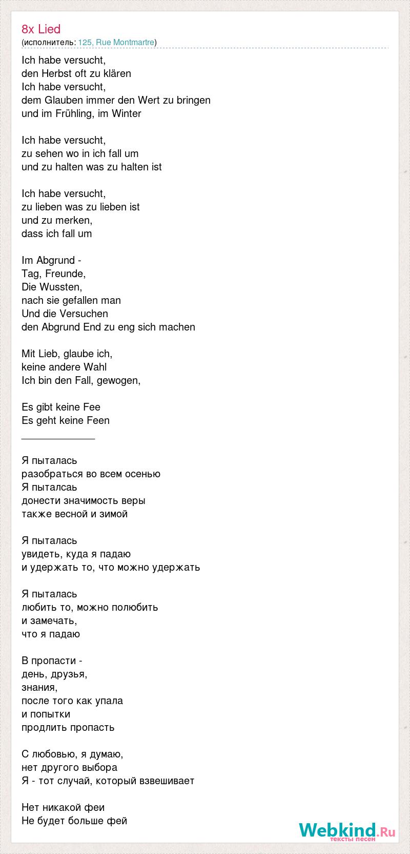 Ich habe versucht, den Herbst oft zu klären Ich habe versucht, dem Glauben immer den Wert zu bringen und im Frühling, im Winter Ich habe versucht, zu sehen wo in ich fall um und zu halten was zu halten ist Ich habe versucht, zu lieben was zu lieben ist und zu merken, dass ich fall um Im [bad word] - Tag, Freunde, Die Wussten, nach sie gefallen man Und die Versuchen den [bad word] End zu eng sich machen Mit Lieb, glaube ich, keine andere Wahl Ich bin den Fall, gewogen, Es gibt keine Fee Es geht keine Feen _____________ Я пыталась разобраться во всем осенью Я пыталсаь донести значимость веры также весной и зимой Я пыталась увидеть, куда я падаю и удержать то, что можно удержать Я пыталась любить то, можно полюбить и замечать, что я падаю В пропасти - день, друзья, знания, после того как упала и попытки продлить пропасть С любовью, я думаю, нет другого выбора Я - тот случай, который взвешивает Нет никакой феи Не будет больше фей