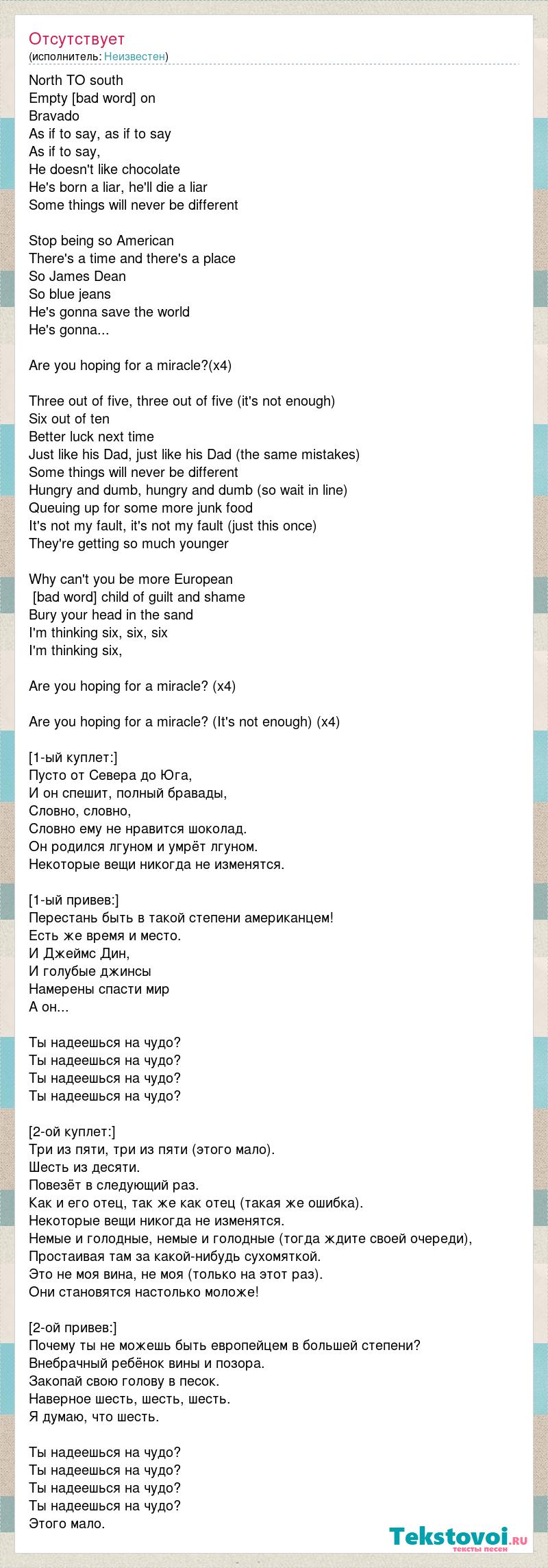 North TO south Empty [bad word] on Bravado As if to say, as if to say As if to say, He doesn't like chocolate He's born a liar, he'll die a liar Some things will never be different Stop being so American There's a time and there's a place So James Dean So blue jeans He's gonna save the world He's gonna... Are you hoping for a miracle?(x4) Three out of five, three out of five (it's not enough) Six out of ten Better luck next time Just like his Dad, just like his Dad (the same mistakes) Some things will never be different Hungry and dumb, hungry and dumb (so wait in line) Queuing up for some more junk food It's not my fault, it's not my fault (just this once) They're getting so much younger Why can't you be more European [bad word] child of guilt and shame Bury your head in the sand I'm thinking six, six, six I'm thinking six, Are you hoping for a miracle? (x4) Are you hoping for a miracle? (It's not enough) (x4) [1-ый куплет:] Пусто от Севера до Юга, И он спешит, полный бравады, Словно, словно, Словно ему не нравится шоколад. Он родился лгуном и умрёт лгуном. Некоторые вещи никогда не изменятся. [1-ый привев:] Перестань быть в такой степени американцем! Есть же время и место. И Джеймс Дин, И голубые джинсы Намерены спасти мир А он... Ты надеешься на чудо? Ты надеешься на чудо? Ты надеешься на чудо? Ты надеешься на чудо? [2-ой куплет:] Три из пяти, три из пяти (этого мало). Шесть из десяти. Повезёт в следующий раз. Как и его отец, так же как отец (такая же ошибка). Некоторые вещи никогда не изменятся. Немые и голодные, немые и голодные (тогда ждите своей очереди), Простаивая там за какой-нибудь сухомяткой. Это не моя вина, не моя (только на этот раз). Они становятся настолько моложе! [2-ой привев:] Почему ты не можешь быть европейцем в большей степени? Внебрачный ребёнок вины и позора. Закопай свою голову в песок. Наверное шесть, шесть, шесть. Я думаю, что шесть. Ты надеешься на чудо? Ты надеешься на чудо? Ты надеешься на чудо? Ты надеешься на чудо? Этого мало.
