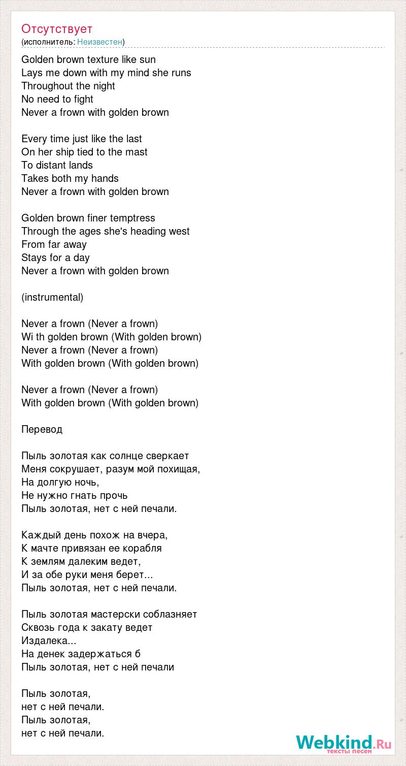 Golden brown texture like sun Lays me down with my mind [bad word] Throughout the night No need to fight Never a frown with golden brown Every time just like the last On her ship tied to the mast To distant lands Takes both my hands Never a frown with golden brown Golden brown finer temptress Through the ages she's heading west From far away Stays for a day Never a frown with golden brown [bad word] Never a frown (Never a frown) Wi th golden brown (With golden brown) Never a frown (Never a frown) With golden brown (With golden brown) Never a frown (Never a frown) With golden brown (With golden brown) Перевод Пыль золотая как солнце сверкает Меня сокрушает, разум мой похищая, На долгую ночь, Не нужно гнать прочь Пыль золотая, нет с ней печали. Каждый день похож на вчера, К мачте привязан ее корабля К землям далеким ведет, И за обе руки меня берет... Пыль золотая, нет с ней печали. Пыль золотая мастерски соблазняет Сквозь года к закату ведет Издалека... На денек задержаться б Пыль золотая, нет с ней печали Пыль золотая, нет с ней печали. Пыль золотая, нет с ней печали.