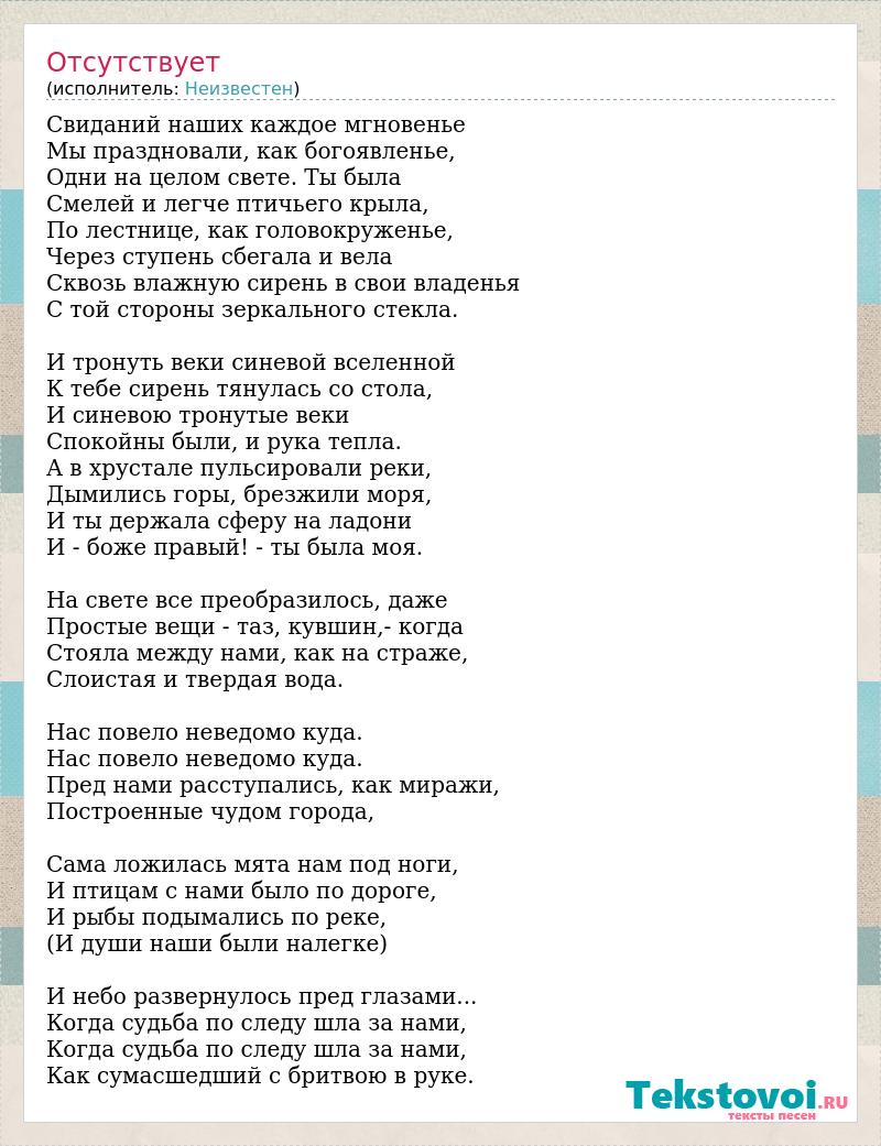 Свиданий наших каждое мгновенье Мы праздновали, как богоявленье, Одни на целом свете. Ты была Смелей и легче птичьего крыла, По лестнице, как головокруженье, Через ступень сбегала и вела Сквозь влажную сирень в свои владенья С той стороны зеркального стекла. И тронуть веки синевой вселенной К тебе сирень тянулась со стола, И синевою тронутые веки Спокойны были, и рука тепла. А в хрустале пульсировали реки, Дымились горы, брезжили моря, И ты держала сферу на ладони И - боже правый! - ты была моя. На свете все преобразилось, даже Простые вещи - таз, кувшин,- когда Стояла между нами, как на страже, Слоистая и твердая вода. Нас повело неведомо куда. Нас повело неведомо куда. Пред нами расступались, как миражи, Построенные чудом города, Сама ложилась мята нам под ноги, И птицам с нами было по дороге, И рыбы подымались по реке, (И души наши были налегке) И небо развернулось пред глазами... Когда судьба по следу шла за нами, Когда судьба по следу шла за нами, Как сумасшедший с бритвою в руке.