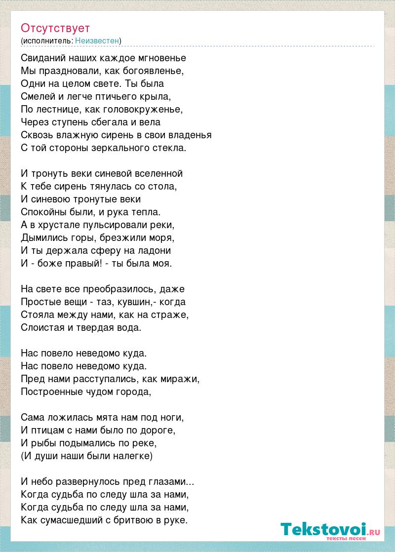Свиданий наших каждое мгновенье Мы праздновали, как богоявленье, Одни на целом свете. Ты была Смелей и легче птичьего крыла, По лестнице, как головокруженье, Через ступень сбегала и вела Сквозь влажную сирень в свои владенья С той стороны зеркального стекла. И тронуть веки синевой вселенной К тебе сирень тянулась со стола, И синевою тронутые веки Спокойны были, и рука тепла. А в хрустале пульсировали реки, Дымились горы, брезжили моря, И ты держала сферу на ладони И - боже правый! - ты была моя. На свете все преобразилось, даже Простые вещи - таз, кувшин,- когда Стояла между нами, как на страже, Слоистая и твердая вода. Нас повело неведомо куда. Нас повело неведомо куда. Пред нами расступались, как миражи, Построенные чудом города, Сама ложилась мята нам под ноги, И птицам с нами было по дороге, И рыбы подымались по реке, (И души наши были налегке) И небо развернулось пред глазами... Когда судьба по следу шла за нами, Когда судьба по следу шла за нами, Как сумасшедший с бритвою в руке.