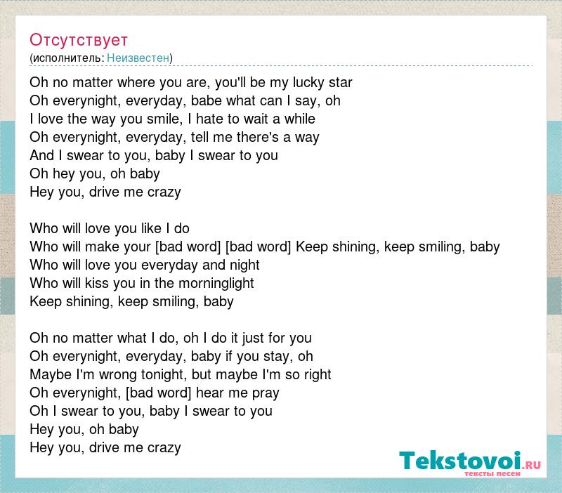 Oh no matter where you are, you'll be my lucky star Oh everynight, everyday, babe what can I say, oh I love the way you smile, I hate to wait a while Oh everynight, everyday, tell me there's a way And I swear to you, baby I swear to you Oh hey you, oh baby Hey you, drive me crazy Who will love you like I do Who will make your [bad word] [bad word] Keep shining, keep smiling, baby Who will love you everyday and night Who will kiss you in the morninglight Keep shining, keep smiling, baby Oh no matter what I do, oh I do it just for you Oh everynight, everyday, baby if you stay, oh Maybe I'm wrong tonight, but maybe I'm so right Oh everynight, [bad word] hear me pray Oh I swear to you, baby I swear to you Hey you, oh baby Hey you, drive me crazy
