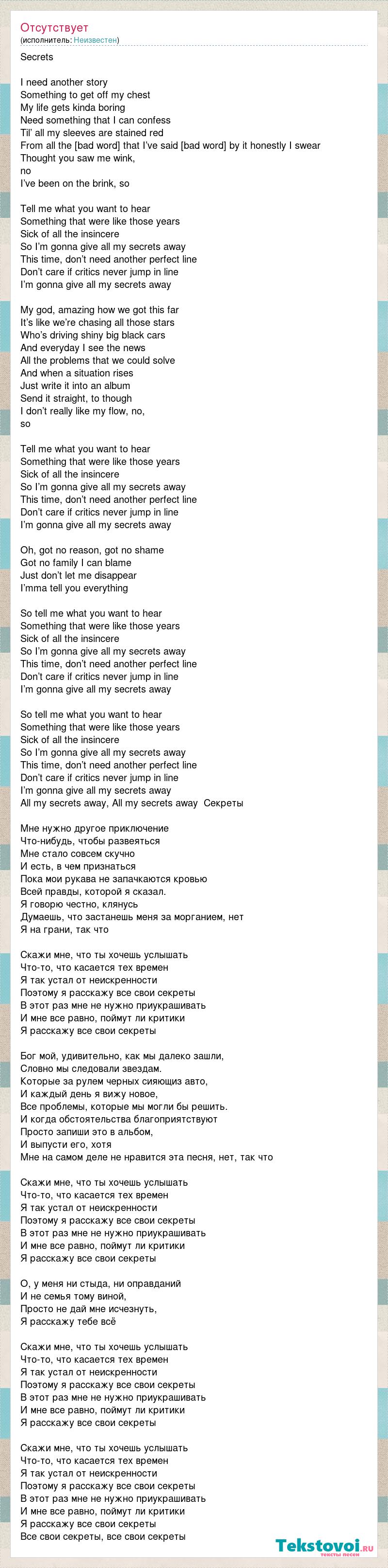 Secrets I need another story Something to get off my chest My life gets kinda boring Need something that I can confess Til’ all my sleeves are stained red From all the [bad word] that I’ve said [bad word] by it honestly I swear Thought you saw me wink, no I’ve been on the brink, so Tell me what you want to hear Something that were like those years Sick of all the insincere So I’m gonna give all my secrets away This time, don’t need another perfect line Don’t care if critics never jump in line I’m gonna give all my secrets away My god, amazing how we got this far It’s like we’re chasing all those stars Who’s driving shiny big black cars And everyday I see the news All the problems that we could solve And when a situation rises Just write it into an album Send it straight, to though I don’t really like my flow, no, so Tell me what you want to hear Something that were like those years Sick of all the insincere So I’m gonna give all my secrets away This time, don’t need another perfect line Don’t care if critics never jump in line I’m gonna give all my secrets away Oh, got no reason, got no shame Got no family I can blame Just don’t let me disappear I’mma tell you everything So tell me what you want to hear Something that were like those years Sick of all the insincere So I’m gonna give all my secrets away This time, don’t need another perfect line Don’t care if critics never jump in line I’m gonna give all my secrets away So tell me what you want to hear Something that were like those years Sick of all the insincere So I’m gonna give all my secrets away This time, don’t need another perfect line Don’t care if critics never jump in line I’m gonna give all my secrets away All my secrets away, All my secrets away Секреты Мне нужно другое приключение Что-нибудь, чтобы развеяться Мне стало совсем скучно И есть, в чем признаться Пока мои рукава не запачкаются кровью Всей правды, которой я сказал. Я говорю честно, клянусь Думаешь, что застанешь меня за морганием, нет Я на грани, так что Скажи мне, что ты хочешь услышать Что-то, что касается тех времен Я так устал от неискренности Поэтому я расскажу все свои секреты В этот раз мне не нужно приукрашивать И мне все равно, поймут ли критики Я расскажу все свои секреты Бог мой, удивительно, как мы далеко зашли, Словно мы следовали звездам. Которые за рулем черных сияющиз авто, И каждый день я вижу новое, Все проблемы, которые мы могли бы решить. И когда обстоятельства благоприятствуют Просто запиши это в альбом, И выпусти его, хотя Мне на самом деле не нравится эта песня, нет, так что Скажи мне, что ты хочешь услышать Что-то, что касается тех времен Я так устал от неискренности Поэтому я расскажу все свои секреты В этот раз мне не нужно приукрашивать И мне все равно, поймут ли критики Я расскажу все свои секреты О, у меня ни стыда, ни оправданий И не семья тому виной, Просто не дай мне исчезнуть, Я расскажу тебе всё Скажи мне, что ты хочешь услышать Что-то, что касается тех времен Я так устал от неискренности Поэтому я расскажу все свои секреты В этот раз мне не нужно приукрашивать И мне все равно, поймут ли критики Я расскажу все свои секреты Скажи мне, что ты хочешь услышать Что-то, что касается тех времен Я так устал от неискренности Поэтому я расскажу все свои секреты В этот раз мне не нужно приукрашивать И мне все равно, поймут ли критики Я расскажу все свои секреты Все свои секреты, все свои секреты