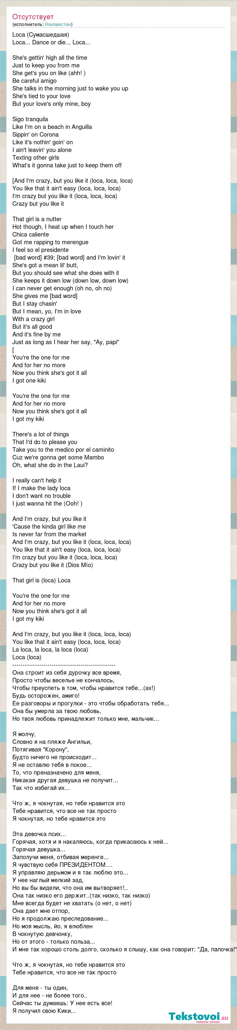 Loca (Сумасшедшая) Loca... Dance or die... Loca... She's gettin' high all the time Just to keep you from me She get's you on like (ahh! ) Be careful amigo She talks in the morning just to wake you up She's tied to your love But your love's only mine, boy Sigo tranquila Like I'm on a beach in Anguilla Sippin' on Corona Like it's nothin' goin' on I ain't leavin' you alone Texting other girls What's it gonna take just to keep them off [And I'm crazy, but you like it (loca, loca, loca) You like that it ain't easy (loca, loca, loca) I'm crazy but you like it (loca, loca, loca) Crazy but you like it That girl is a nutter Hot though, I heat up when I touch her Chica caliente Got me rapping to merengue I feel so el presidente [bad word] #39; [bad word] and I'm lovin' it She's got a mean lil' butt, But you should see what she does with it She keeps it down low (down low, down low) I can never get enough (oh no, oh no) She gives me [bad word] But I stay chasin' But I mean, yo, I'm in love With a crazy girl But it's all good And it's fine by me Just as long as I hear her say, "Ay, papi" [ You're the one for me And for her no more Now you think she's got it all I got one kiki You're the one for me And for her no more Now you think she's got it all I got my kiki There's a lot of things That I'd do to please you Take you to the medico por el caminito Cuz we're gonna get some Mambo Oh, what she do in the Laui? I really can't help it If I make the lady loca I don't want no trouble I just wanna hit the (Ooh! ) And I'm crazy, but you like it 'Cause the kinda girl like me Is never far from the market And I'm crazy, but you like it (loca, loca, loca) You like that it ain't easy (loca, loca, loca) I'm crazy but you like it (loca, loca, loca) Crazy but you like it (Dios Mío) That girl is (loca) Loca You're the one for me And for her no more Now you think she's got it all I got my kiki And I'm crazy, but you like it (loca, loca, loca) You like that it ain't easy (loca, loca, loca) La loca, la loca, la loca (loca) Loca (loca) -------------------------------------------------- Она строит из себя дурочку все время, Просто чтобы веселье не кончалось, Чтобы преуспеть в том, чтобы нравится тебе...(ах!) Будь осторожен, амиго! Ее разговоры и прогулки - это чтобы обработать тебя... Она бы умерла за твою любовь, Но твоя любовь принадлежит только мне, мальчик... Я молчу, Словно я на пляже Ангильи, Потягивая "Корону", Будто ничего не происходит... Я не оставлю тебя в покое... То, что преназначено для меня, Никакая другая девушка не получит... Так что избегай их... Что ж, я чокнутая, но тебе нравится это Тебе нравится, что все не так просто Я чокнутая, но тебе нравится это Эта девочка псих... Горячая, хотя и я накаляюсь, когда прикасаюсь к ней... Горячая девушка... Заполучи меня, отбивая меренге... Я чувствую себя ПРЕЗИДЕНТОМ.... Я управляю дерьмом и я так люблю это... У нее наглый мелкий зад, Но вы бы видели, что она им вытворяет!.. Она так низко его держит..(так низко, так низко) Мне всегда будет не хватать (о нет, о нет) Она дает мне отпор, Но я продолжаю преследование... Но моя мысль, йо, я влюблен В чокнутую девчонку, Но от этого - только польза... И мне так хорошо столь долго, сколько я слышу, как она говорит: "Да, папочка!" Что ж, я чокнутая, но тебе нравится это Тебе нравится, что все не так просто Для меня - ты один, И для нее - не более того.. Сейчас ты думаешь: У нее есть все! Я получил свою Кики...
