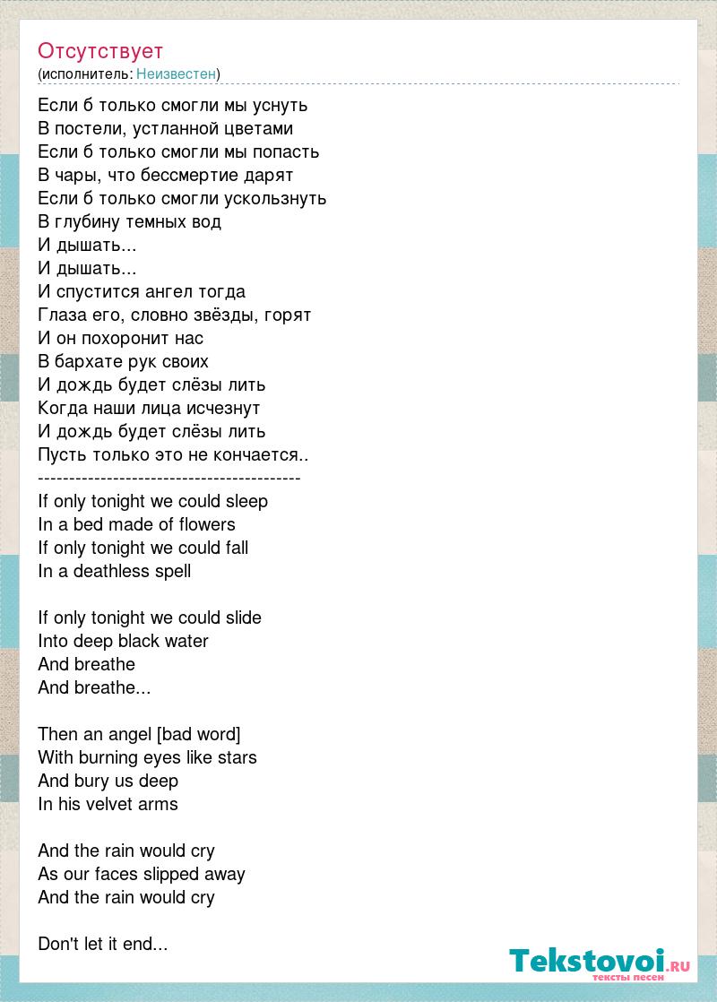 Если б только смогли мы уснуть В постели, устланной цветами Если б только смогли мы попасть В чары, что бессмертие дарят Если б только смогли ускользнуть В глубину темных вод И дышать... И дышать... И спустится ангел тогда Глаза его, словно звёзды, горят И он похоронит нас В бархате рук своих И дождь будет слёзы лить Когда наши лица исчезнут И дождь будет слёзы лить Пусть только это не кончается.. ------------------------------------------ If only tonight we could sleep In a bed made of flowers If only tonight we could fall In a deathless spell If only tonight we could slide Into deep black water And breathe And breathe... Then an angel [bad word] With burning eyes like stars And bury us deep In his velvet arms And the rain would cry As our faces slipped away And the rain would cry Don't let it end...