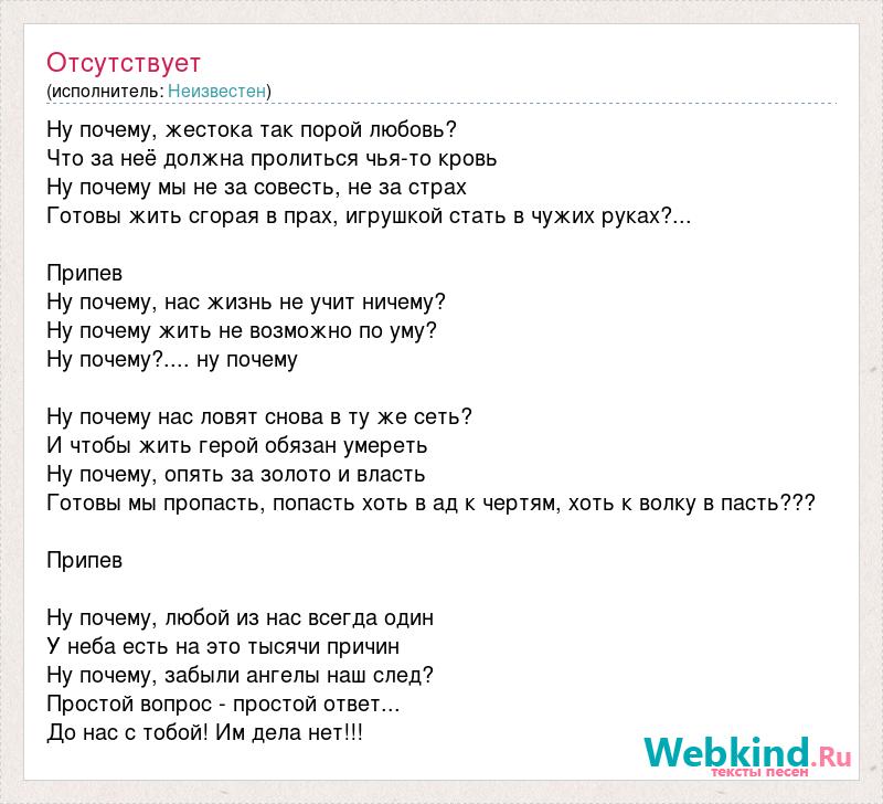 Ну почему, жестока так порой любовь? Что за неё должна пролиться чья-то кровь Ну почему мы не за совесть, не за страх Готовы жить сгорая в прах, игрушкой стать в чужих руках?... Припев Ну почему, нас жизнь не учит ничему? Ну почему жить не возможно по уму? Ну почему?.... ну почему Ну почему нас ловят снова в ту же сеть? И чтобы жить герой обязан умереть Ну почему, опять за золото и власть Готовы мы пропасть, попасть хоть в ад к чертям, хоть к волку в пасть??? Припев Ну почему, любой из нас всегда один У неба есть на это тысячи причин Ну почему, забыли ангелы наш след? Простой вопрос - простой ответ... До нас с тобой! Им дела нет!!!