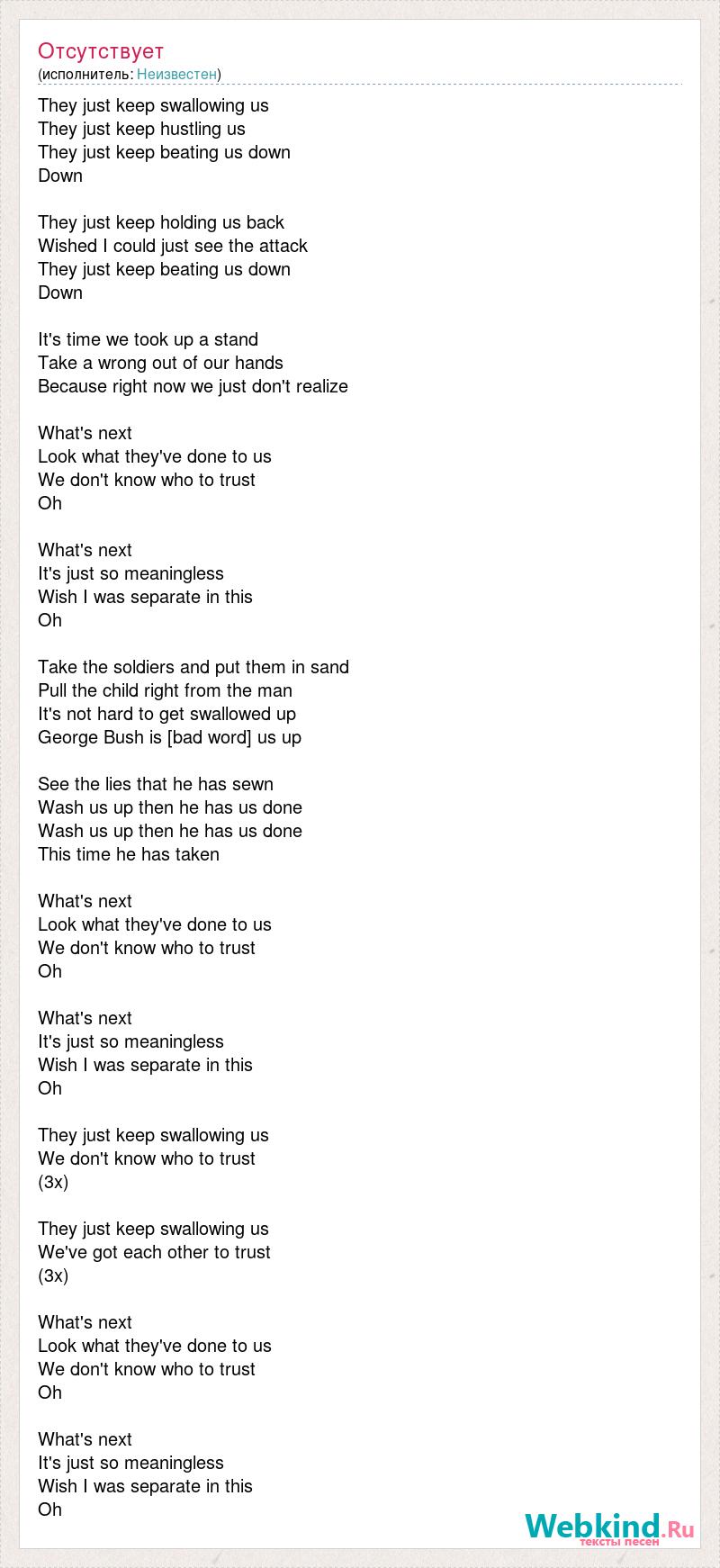They just keep swallowing us They just keep hustling us They just keep beating us down Down They just keep holding us back Wished I could just see the attack They just keep beating us down Down It's time we took up a stand Take a wrong out of our hands Because right now we just don't realize What's next Look what they've done to us We don't know who to [bad word] Oh What's next It's just so meaningless Wish I was separate in this Oh Take the soldiers and put them in sand Pull the child right from the man It's not hard to get swallowed up George Bush is [bad word] us up See the lies that he has sewn Wash us up then he has us done Wash us up then he has us done This time he has taken What's next Look what they've done to us We don't know who to [bad word] Oh What's next It's just so meaningless Wish I was separate in this Oh They just keep swallowing us We don't know who to [bad word] (3x) They just keep swallowing us We've got each other to [bad word] (3x) What's next Look what they've done to us We don't know who to [bad word] Oh What's next It's just so meaningless Wish I was separate in this Oh