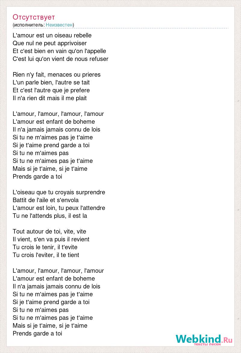 L'amour est un oiseau rebelle Que nul ne peut apprivoiser Et c'est bien en vain qu'on l'appelle C'est lui qu'on vient de nous refuser Rien n'y fait, menaces ou prieres L'un parle bien, l'autre se tait Et c'est l'autre que je prefere Il n'a rien dit mais il me plait L'amour, l'amour, l'amour, l'amour L'amour est enfant de boheme Il n'a jamais jamais connu de lois Si tu ne m'aimes pas je t'aime Si je t'aime prend garde a toi Si tu ne m'aimes pas Si tu ne m'aimes pas je t'aime Mais si je t'aime, si je t'aime Prends garde a toi L'oiseau que tu croyais surprendre Battit de l'aile et s'envola L'amour est loin, tu peux l'attendre Tu ne l'attends plus, il est la Tout autour de toi, vite, vite Il vient, s'en va puis il revient Tu crois le tenir, il t'evite Tu crois l'eviter, il te tient L'amour, l'amour, l'amour, l'amour L'amour est enfant de boheme Il n'a jamais jamais connu de lois Si tu ne m'aimes pas je t'aime Si je t'aime prend garde a toi Si tu ne m'aimes pas Si tu ne m'aimes pas je t'aime Mais si je t'aime, si je t'aime Prends garde a toi