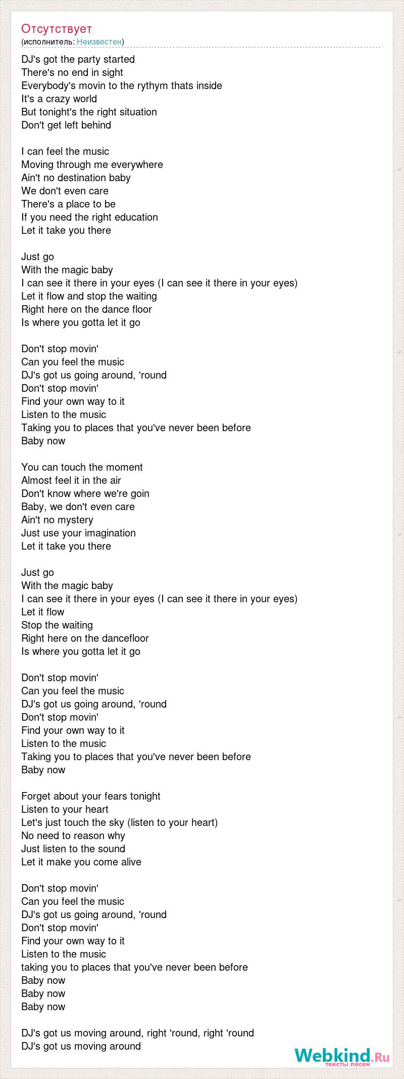 DJ's got the party started There's no end in sight Everybody's movin to the rythym thats inside It's a crazy world But tonight's the right situation Don't get left behind I can feel the music Moving through me everywhere Ain't no destination baby We don't even care There's a place to be If you need the right education Let it take you there Just go With the magic baby I can see it there in your eyes (I can see it there in your eyes) Let it flow and stop the waiting Right here on the dance floor Is where you gotta let it go Don't stop movin' Can you feel the music DJ's got us going around, 'round Don't stop movin' Find your own way to it Listen to the music Taking you to places that you've never been before Baby now You can touch the moment Almost feel it in the air Don't know where we're goin Baby, we don't even care Ain't no mystery Just use your imagination Let it take you there Just go With the magic baby I can see it there in your eyes (I can see it there in your eyes) Let it flow Stop the waiting Right here on the dancefloor Is where you gotta let it go Don't stop movin' Can you feel the music DJ's got us going around, 'round Don't stop movin' Find your own way to it Listen to the music Taking you to places that you've never been before Baby now Forget about your fears tonight Listen to your heart Let's just touch the sky (listen to your heart) No need to reason why Just listen to the sound Let it make [bad word] alive Don't stop movin' Can you feel the music DJ's got us going around, 'round Don't stop movin' Find your own way to it Listen to the music taking you to places that you've never been before Baby now Baby now Baby now DJ's got us moving around, right 'round, right 'round DJ's got us moving around