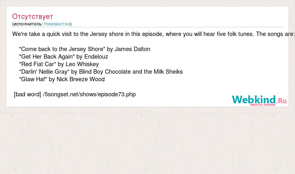 We're take a quick visit to the Jersey shore in this episode, where you will hear five folk tunes. The songs are: