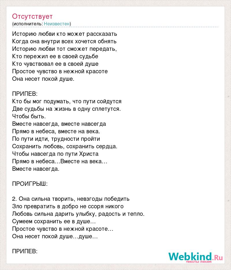 Историю любви кто может рассказать Когда она внутри всех хочется обнять Историю любви тот сможет передать, Кто пережил ее в своей судьбе Кто чувствовал ее в своей душе Простое чувство в нежной красоте Она несет покой душе. ПРИПЕВ: Кто бы мог подумать, что пути сойдутся Две судьбы на жизнь в одну сплетутся. Чтобы быть. Вместе навсегда, вместе навсегда Прямо в небеса, вместе на века. По пути идти, трудности пройти Сохранить любовь, сохранить сердца. Чтобы навсегда по пути Христа Прямо в небеса…Вместе на века… Вместе навсегда. ПРОИГРЫШ: 2. Она сильна творить, невзгоды победить Зло превратить в добро не ссоря никого Любовь сильна дарить улыбку, радость и тепло. Сумеем сохранить ее в душе… Простое чувство в нежной красоте… Она несет покой душе…душе… ПРИПЕВ: