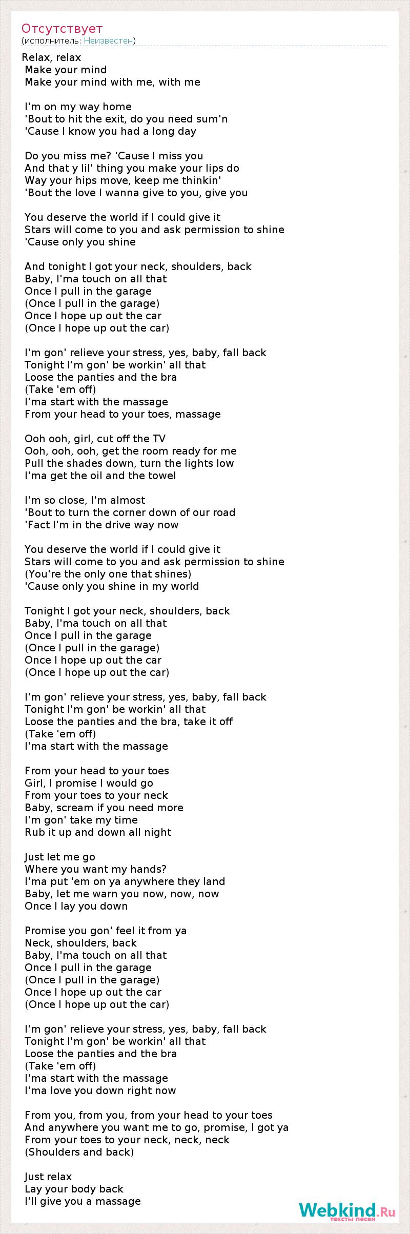 Relax, relax Make your mind Make your mind with me, with me I'm on my way home 'Bout to hit the exit, do you need sum'n 'Cause I know you had a long day Do you miss me? 'Cause I miss you And that y lil' thing you make your lips do Way your hips move, keep me thinkin' 'Bout the love I wanna give to you, give you You deserve the world if I could give it Stars [bad word] to you and ask permission to shine 'Cause only you shine And tonight I got your neck, shoulders, back Baby, I'ma touch on all that Once I pull in the garage (Once I pull in the garage) Once I hope up out the car (Once I hope up out the car) I'm gon' relieve your stress, yes, baby, fall back Tonight I'm gon' be workin' all that Loose the panties and the bra (Take 'em off) I'ma start with the massage From your head to your toes, massage Ooh ooh, girl, cut off the TV Ooh, ooh, ooh, get the room ready for me Pull the shades down, turn the lights low I'ma get the oil and the towel I'm so close, I'm almost 'Bout to turn the corner down of our road 'Fact I'm in the drive way now You deserve the world if I could give it Stars [bad word] to you and ask permission to shine (You're the only one that shines) 'Cause only you shine in my world Tonight I got your neck, shoulders, back Baby, I'ma touch on all that Once I pull in the garage (Once I pull in the garage) Once I hope up out the car (Once I hope up out the car) I'm gon' relieve your stress, yes, baby, fall back Tonight I'm gon' be workin' all that Loose the panties and the bra, take it off (Take 'em off) I'ma start with the massage From your head to your toes Girl, I promise I would go From your toes to your neck Baby, scream if you need more I'm gon' take my time [bad word] it up and down all night Just let me go Where you want my hands? I'ma put 'em on ya anywhere they land Baby, let me warn you now, now, now Once I lay you down Promise you gon' feel it from ya Neck, shoulders, back Baby, I'ma touch on all that Once I pull in the garage (Once I pull in the garage) Once I hope up out the car (Once I hope up out the car) I'm gon' relieve your stress, yes, baby, fall back Tonight I'm gon' be workin' all that Loose the panties and the bra (Take 'em off) I'ma start with the massage I'ma love you down right now From you, from you, from your head to your toes And anywhere you want me to go, promise, I got ya From your toes to your neck, neck, neck (Shoulders and back) Just relax Lay your body back I'll give you a massage