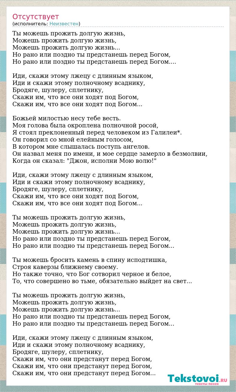 Ты можешь прожить долгую жизнь, Можешь прожить долгую жизнь, Можешь прожить долгую жизнь... Но рано или поздно ты предстанешь перед Богом, Но рано или поздно ты предстанешь перед Богом.... Иди, скажи этому лжецу с длинным языком, Иди и скажи этому полночному всаднику, Бродяге, шулеру, сплетнику, Скажи им, что все они ходят под Богом, Скажи им, что все они ходят под Богом... Божьей милостью несу тебе весть. Моя голова была окроплена полночной росой, Я стоял преклоненный перед человеком из Галилеи*. Он говорил со мной елейным голосом, В котором мне слышалась поступь ангелов. Он назвал меня по имени, и мое сердце замерло в безмолвии, Когда он сказал: "Джон, исполни Мою волю!" Иди, скажи этому лжецу с длинным языком, Иди и скажи этому полночному всаднику, Бродяге, шулеру, сплетнику, Скажи им, что все они ходят под Богом, Скажи им, что все они ходят под Богом... Ты можешь прожить долгую жизнь, Можешь прожить долгую жизнь, Можешь прожить долгую жизнь... Но рано или поздно ты предстанешь перед Богом, Но рано или поздно ты предстанешь перед Богом... Ты можешь бросить камень в спину исподтишка, Строя каверзы ближнему своему. Но также точно, что Бог сотворил черное и белое, То, что совершено во тьме, обязательно выйдет на свет... Ты можешь прожить долгую жизнь, Можешь прожить долгую жизнь, Можешь прожить долгую жизнь... Но рано или поздно ты предстанешь перед Богом, Но рано или поздно ты предстанешь перед Богом... Иди, скажи этому лжецу с длинным языком, Иди и скажи этому полночному всаднику, Бродяге, шулеру, сплетнику, Скажи им, что они предстанут перед Богом, Скажи им, что они предстанут перед Богом, Скажи им, что они предстанут перед Богом...