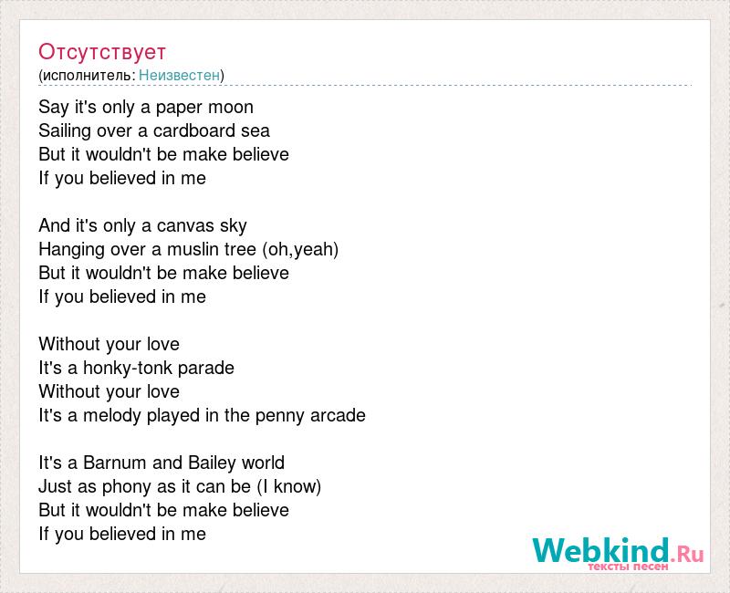 Say it's only a paper moon Sailing over a cardboard sea But it wouldn't be make believe If you believed in me And it's only a canvas sky Hanging over a muslin tree (oh,yeah) But it wouldn't be make believe If you believed in me Without your love It's a honky-tonk parade Without your love It's a melody played in the penny arcade It's a Barnum and Bailey world Just as phony as it can be (I know) But it wouldn't be make believe If you believed in me