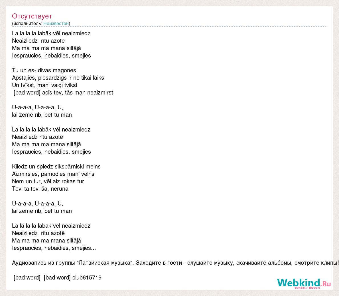 La la la la labāk vēl neaizmiedz Neaizliedz rītu azotē Ma ma ma ma mana siltājā Iespraucies, nebaidies, smejies Tu un es- divas magones Apstājies, piesardzīgs ir ne tikai laiks Un tvīkst, mani vaigi tvīkst [bad word] acīs tev, tās man neaizmirst U-a-a-a, U-a-a-a, U, lai zeme rīb, bet tu man La la la la labāk vēl neaizmiedz Neaizliedz rītu azotē Ma ma ma ma mana siltājā Iespraucies, nebaidies, smejies Kliedz un spiedz sikspārniski melns Aizmirsies, pamodies manī velns Ņem un tur, vēl aiz rokas tur Tevi tā tevi šā, [bad word] #257; U-a-a-a, U-a-a-a, U, lai zeme rīb, bet tu man La la la la labāk vēl neaizmiedz Neaizliedz rītu azotē Ma ma ma ma mana siltājā Iespraucies, nebaidies, smejies... Aудиозапись из группы "Латвийская музыка". Заходите в гости - слушайте музыку, скачивайте альбомы, смотрите клипы! [bad word] [bad word] club615719