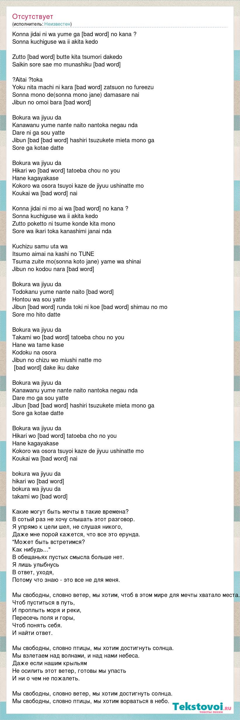 Konna jidai ni wa yume ga [bad word] no kana ? Sonna kuchiguse wa ii akita kedo Zutto [bad word] butte kita tsumori dakedo Saikin sore sae mo munashiku [bad word] ?Aitai ?toka Yoku nita machi ni kara [bad word] zatsuon no fureezu Sonna mono de(sonna mono jane) damasare nai Jibun no omoi bara [bad word] Bokura wa jiyuu da Kanawanu yume nante naito nantoka negau nda Dare ni ga sou yatte Jibun [bad [bad word] hashiri tsuzukete mieta mono ga Sore ga kotae datte Bokura wa jiyuu da Hikari wo [bad word] tatoeba chou no you Hane kagayakase Kokoro wa osora tsuyoi kaze de jiyuu ushinatte mo Koukai wa [bad word] nai Konna jidai ni mo ai wa [bad word] no kana ? Sonna kuchiguse wa ii akita kedo Zutto poketto ni tsume konde kita mono Sore wa ikari toka kanashimi janai nda Kuchizu samu uta wa Itsumo aimai na kashi no TUNE Tsuma zuite mo(sonna koto jane) yame wa shinai Jibun no kodou nara [bad word] Bokura wa jiyuu da Todokanu yume nante naito [bad word] Hontou wa sou yatte Jibun [bad word] runda toki ni koe [bad word] shimau no mo Sore mo hito datte Bokura wa jiyuu da Takami wo [bad word] tatoeba chou no you Hane wa tame kase Kodoku na osora Jibun no chizu wo miushi natte mo [bad word] dake iku dake Bokura wa jiyuu da Kanawanu yume nante naito nantoka negau nda Dare mo ga sou yatte Jibun [bad [bad word] hashiri tsuzukete mieta mono ga Sore ga kotae datte Bokura wa jiyuu da Hikari wo [bad word] tatoeba cho no you Hane kagayakase Kokoro wa osora tsuyoi kaze de jiyuu ushinatte mo Koukai wa [bad word] nai bokura wa jiyuu da hikari wo [bad word] bokura wa jiyuu da takami wo [bad word] Какие могут быть мечты в такие времена? В сотый раз не хочу слышать этот разговор. Я упрямо к цели шел, не слушая никого, Даже мне порой кажется, что все это ерунда. "Может быть встретимся? Как нибудь..." В обещаньях пустых смысла больше нет. Я лишь улыбнусь В ответ, уходя, Потому что знаю - это все не для меня. Мы свободны, словно ветер, мы хотим, чтоб в этом мире для мечты хватало места. Чтоб пуститься в путь, И проплыть моря и реки, Пересечь поля и горы, Чтоб понять себя. И найти ответ. Мы свободны, словно птицы, мы хотим достигнуть солнца. Мы взлетаем над волнами, и над нами небеса. Даже если нашим крыльям Не осилить этот ветер, готовы мы упасть И ни о чем не пожалеть. Мы свободны, словно ветер, мы хотим достигнуть солнца. Мы свободны, словно птицы, мы хотим ворваться в небо.