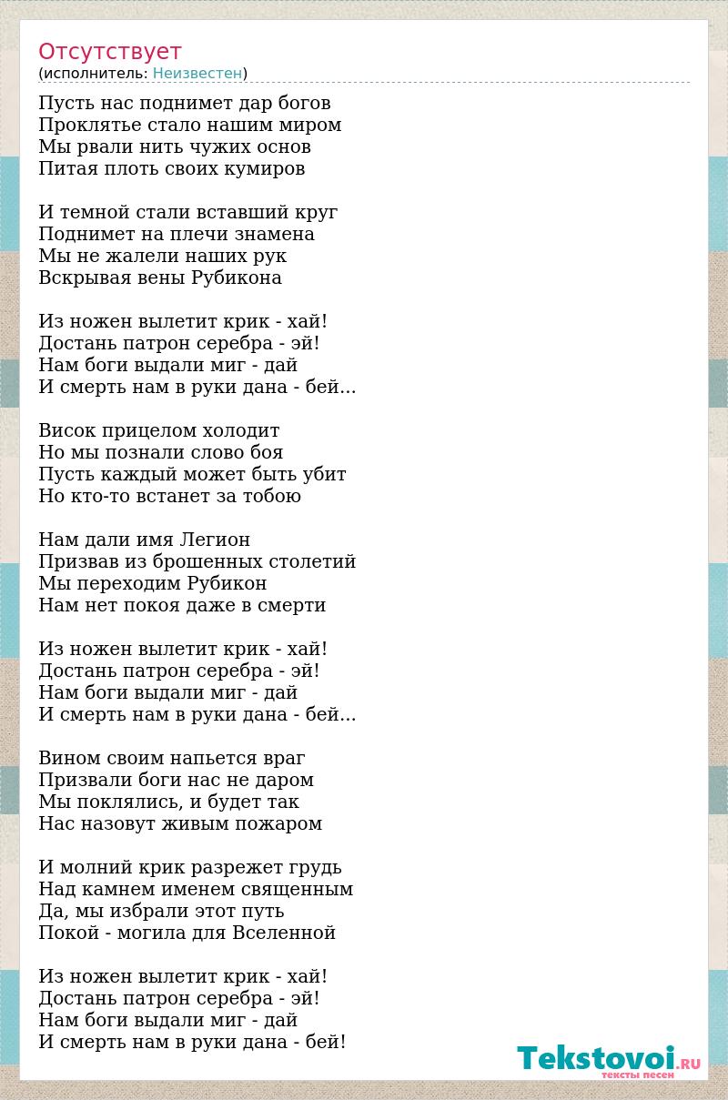 Пусть нас поднимет дар богов Проклятье стало нашим миром Мы рвали нить чужих основ Питая плоть своих кумиров И темной стали вставший круг Поднимет на плечи знамена Мы не жалели наших рук Вскрывая вены Рубикона Из ножен вылетит крик - хай! Достань патрон серебра - эй! Нам боги выдали миг - дай И смерть нам в руки дана - бей... Висок прицелом холодит Но мы познали слово боя Пусть каждый может быть убит Но кто-то встанет за тобою Нам дали имя Легион Призвав из брошенных столетий Мы переходим Рубикон Нам нет покоя даже в смерти Из ножен вылетит крик - хай! Достань патрон серебра - эй! Нам боги выдали миг - дай И смерть нам в руки дана - бей... Вином своим напьется враг Призвали боги нас не даром Мы поклялись, и будет так Нас назовут живым пожаром И молний крик разрежет грудь Над камнем именем священным Да, мы избрали этот путь Покой - могила для Вселенной Из ножен вылетит крик - хай! Достань патрон серебра - эй! Нам боги выдали миг - дай И смерть нам в руки дана - бей!