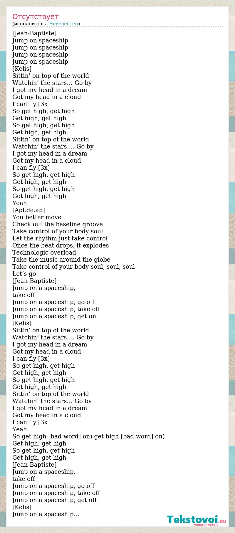 [Jean-Baptiste] Jump on spaceship Jump on spaceship Jump on spaceship Jump on spaceship [Kelis] Sittin’ on top of the world Watchin’ the stars… Go by I got my head in a dream Got my head in a cloud I can fly [3x] So get high, get high Get high, get high So get high, get high Get high, get high Sittin’ on top of the world Watchin’ the stars…. Go by I got my head in a dream Got my head in a cloud I can fly [3x] So get high, get high Get high, get high So get high, get high Get high, get high Yeah [Apl.de.ap] You better move Check out the baseline groove Take control of your body soul Let the rhythm just take control Once the beat drops, it explodes Technologic overload Take the music around the globe Take control of your body soul, soul, soul Let’s go [Jean-Baptiste] Jump on a spaceship, take off Jump on a spaceship, go off Jump on a spaceship, take off Jump on a spaceship, get on [Kelis] Sittin’ on top of the world Watchin’ the stars…. Go by I got my head in a dream Got my head in a cloud I can fly [3x] So get high, get high Get high, get high So get high, get high Get high, get high Sittin’ on top of the world Watchin’ the stars… Go by I got my head in a dream Got my head in a cloud I can fly [3x] Yeah So get high [bad word] on) get high [bad word] on) Get high, get high So get high, get high Get high, get high [Jean-Baptiste] Jump on a spaceship, take off Jump on a spaceship, go off Jump on a spaceship, take off Jump on a spaceship, get off [Kelis] Jump on a spaceship…