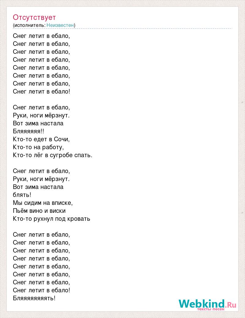 Снег летит в ебало, Снег летит в ебало, Снег летит в ебало, Снег летит в ебало, Снег летит в ебало, Снег летит в ебало, Снег летит в ебало, Снег летит в ебало! Снег летит в ебало, Руки, ноги мёрзнут. Вот зима настала Бляяяяяя!! Кто-то едет в Сочи, Кто-то на работу, Кто-то лёг в сугробе спать. Снег летит в ебало, Руки, ноги мёрзнут. Вот зима настала блять! Мы сидим на вписке, Пьём вино и виски Кто-то рухнул под кровать Снег летит в ебало, Снег летит в ебало, Снег летит в ебало, Снег летит в ебало, Снег летит в ебало, Снег летит в ебало, Снег летит в ебало, Снег летит в ебало! Бляяяяяяяять!