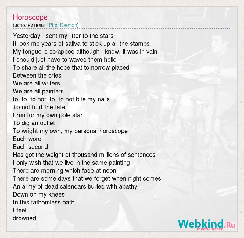 Yesterday I sent my litter to the stars It look me years of saliva to stick up all the stamps My tongue is scrapped although I know, it was in vain I should just have to waved them hello To share all the hope that tomorrow placed Between the cries We are all writers We are all painters to, to, to not, to, to not bite my nails To not hurt the fate [bad word] for my own pole star To dig an outlet To wright my own, my personal horoscope Each word Each second Has got the weight of thousand millions of sentences I only wish that we live in the same painting There are morning which fade at noon There are some days that we forget when [bad word] An army of dead calendars buried with apathy Down on my knees In this fathomless bath I feel drowned