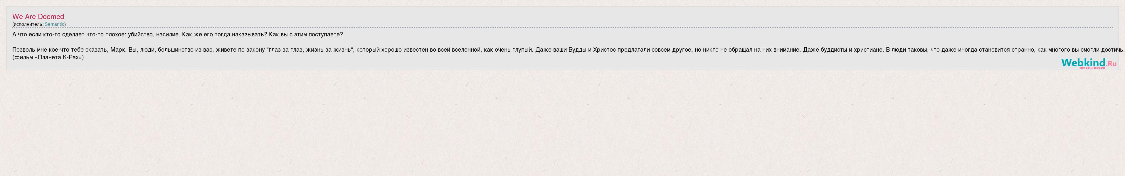 А что если кто-то сделает что-то плохое: убийство, насилие. Как же его тогда наказывать? Как вы с этим поступаете? Позволь мне кое-что тебе сказать, Марк. Вы, люди, большинство из вас, живете по закону "глаз за глаз, жизнь за жизнь", который хорошо известен во всей вселенной, как очень глупый. Даже ваши Будды и Христос предлагали совсем другое, но никто не обращал на них внимание. Даже буддисты и христиане. В люди таковы, что даже иногда становится странно, как многого вы смогли достичь. (фильм «Планета K-Pax»)