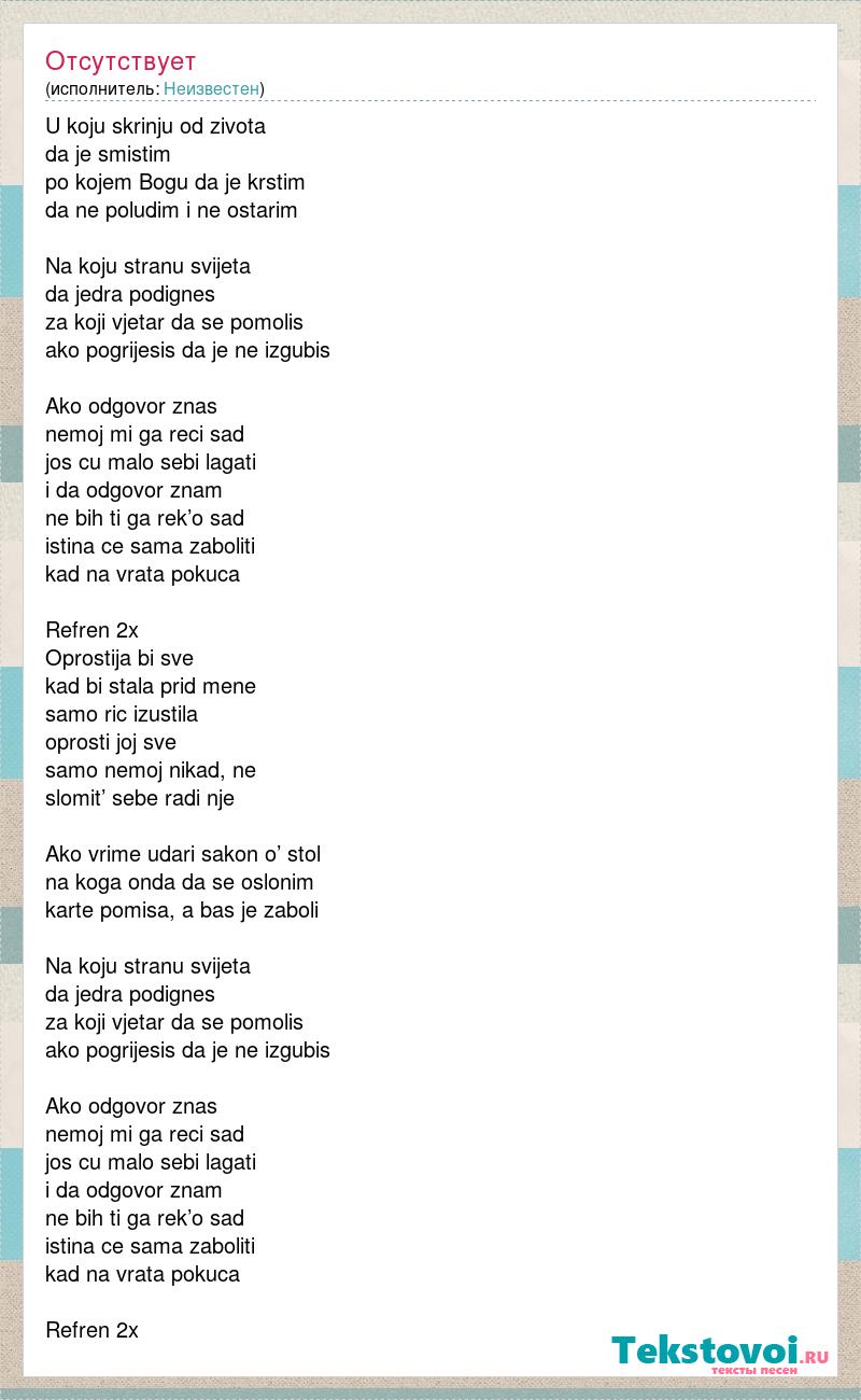 U koju skrinju od zivota da je smistim po kojem Bogu da je krstim da ne poludim i ne ostarim Na koju stranu svijeta da jedra podignes za koji vjetar da se pomolis ako pogrijesis da je ne izgubis Ako odgovor znas nemoj mi ga reci sad jos cu malo sebi lagati i da odgovor znam ne bih ti ga rek’o sad istina ce sama zaboliti kad na vrata pokuca Refren 2x Oprostija bi sve kad bi stala prid mene samo ric izustila oprosti joj sve samo nemoj nikad, ne slomit’ sebe radi nje Ako vrime udari sakon o’ stol na koga onda da se oslonim karte pomisa, a bas je zaboli Na koju stranu svijeta da jedra podignes za koji vjetar da se pomolis ako pogrijesis da je ne izgubis Ako odgovor znas nemoj mi ga reci sad jos cu malo sebi lagati i da odgovor znam ne bih ti ga rek’o sad istina ce sama zaboliti kad na vrata pokuca Refren 2x