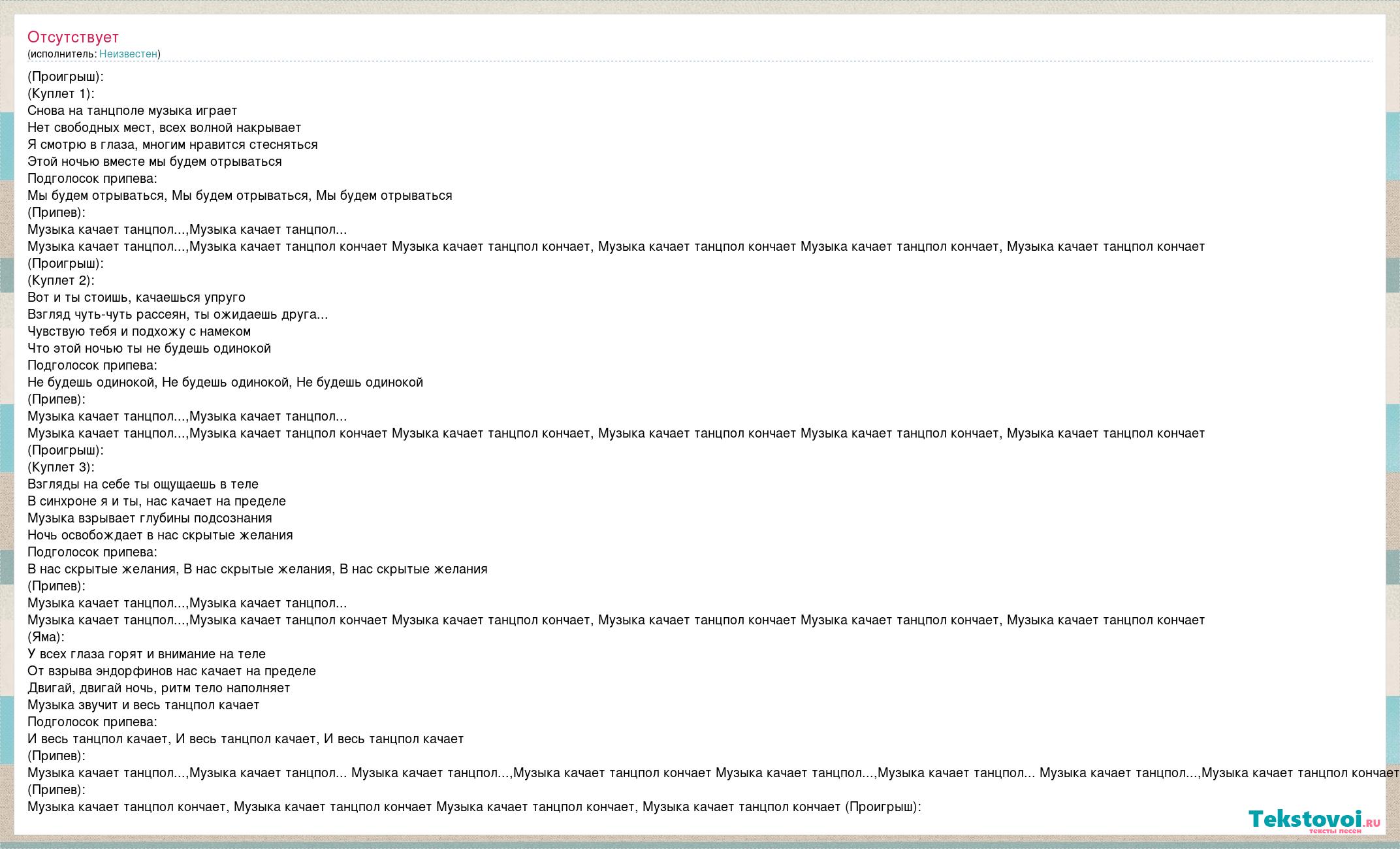 (Проигрыш): (Куплет 1): Снова на танцполе музыка играет Нет свободных мест, всех волной накрывает Я смотрю в глаза, многим нравится стесняться Этой ночью вместе мы будем отрываться Подголосок припева: Мы будем отрываться, Мы будем отрываться, Мы будем отрываться (Припев): Музыка качает танцпол...,Музыка качает танцпол... Музыка качает танцпол...,Музыка качает танцпол кончает Музыка качает танцпол кончает, Музыка качает танцпол кончает Музыка качает танцпол кончает, Музыка качает танцпол кончает (Проигрыш): (Куплет 2): Вот и ты стоишь, качаешься упруго Взгляд чуть-чуть рассеян, ты ожидаешь друга... Чувствую тебя и подхожу с намеком Что этой ночью ты не будешь одинокой Подголосок припева: Не будешь одинокой, Не будешь одинокой, Не будешь одинокой (Припев): Музыка качает танцпол...,Музыка качает танцпол... Музыка качает танцпол...,Музыка качает танцпол кончает Музыка качает танцпол кончает, Музыка качает танцпол кончает Музыка качает танцпол кончает, Музыка качает танцпол кончает (Проигрыш): (Куплет 3): Взгляды на себе ты ощущаешь в теле В синхроне я и ты, нас качает на пределе Музыка взрывает глубины подсознания Ночь освобождает в нас скрытые желания Подголосок припева: В нас скрытые желания, В нас скрытые желания, В нас скрытые желания (Припев): Музыка качает танцпол...,Музыка качает танцпол... Музыка качает танцпол...,Музыка качает танцпол кончает Музыка качает танцпол кончает, Музыка качает танцпол кончает Музыка качает танцпол кончает, Музыка качает танцпол кончает (Яма): У всех глаза горят и внимание на теле От взрыва эндорфинов нас качает на пределе Двигай, двигай ночь, ритм тело наполняет Музыка звучит и весь танцпол качает Подголосок припева: И весь танцпол качает, И весь танцпол качает, И весь танцпол качает (Припев): Музыка качает танцпол...,Музыка качает танцпол... Музыка качает танцпол...,Музыка качает танцпол кончает Музыка качает танцпол...,Музыка качает танцпол... Музыка качает танцпол...,Музыка качает танцпол кончает (Припев): Музыка качает танцпол кончает, Музыка качает танцпол кончает Музыка качает танцпол кончает, Музыка качает танцпол кончает (Проигрыш):