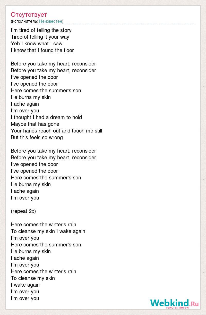I'm tired of telling the story Tired of telling it your way Yeh I know what I saw I know that I found the floor Before you take my heart, reconsider Before you take my heart, reconsider I've opened the door I've opened the door [bad word] the summer's son He burns my skin I ache again I'm over you I thought I had a dream to hold Maybe that has gone Your hands reach out and touch me still But this feels so wrong Before you take my heart, reconsider Before you take my heart, reconsider I've opened the door I've opened the door [bad word] the summer's son He burns my skin I ache again I'm over you (repeat 2x) [bad word] the winter's rain To cleanse my skin I wake again I'm over you [bad word] the summer's son He burns my skin I ache again I'm over you [bad word] the winter's rain To cleanse my skin I wake again I'm over you I'm over you
