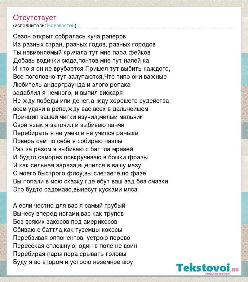 Сезон открыт собралась куча рэперов Из разных стран, разных годов, разных городов Ты невменяемый кричала тут мне пара фейков Добавь водички сюда,понтов мне тут налей ка И кто я он не врубается Пришел тут выбить каждого, Все поголовно тут залупаются,Что типо они важные Любитель андерграунда и злого репака задаблил я немного, и выпил вискаря Не жду победы или денег,а жду хорошего судейства всем удачи в репе,жду вас всех в дальнейшем Принцип вашей читки изучил,милый мальчик Свой язык я заточил,и выбиваю панчи Перебирать я не умею,и не учился раньше Поверь сам по себе я собираю пазлы Раз за разом я выбиваю с баттла мразей И будто саморез повкручиваю в бошки фразы Я как сильная зараза,вцепился в вашу мазу С моего быстрого флоу,вы слетаете по фазе Вы попали в мою сказку,где ебут ваш зад без смазки Это будто садомазо,вынесут кусками мяса А если честно для вас я самый грубый Вынесу вперед ногами,вас как трупов Без всяких закосов под америкосов Сбиваю с баттла,как туземцы кокосы Перебвивая оппонентов, устрою порево Пересекая сплошную, один в поле не воин Перебирая пары пора срывать головы Буду я во втором и устрою неземное шоу