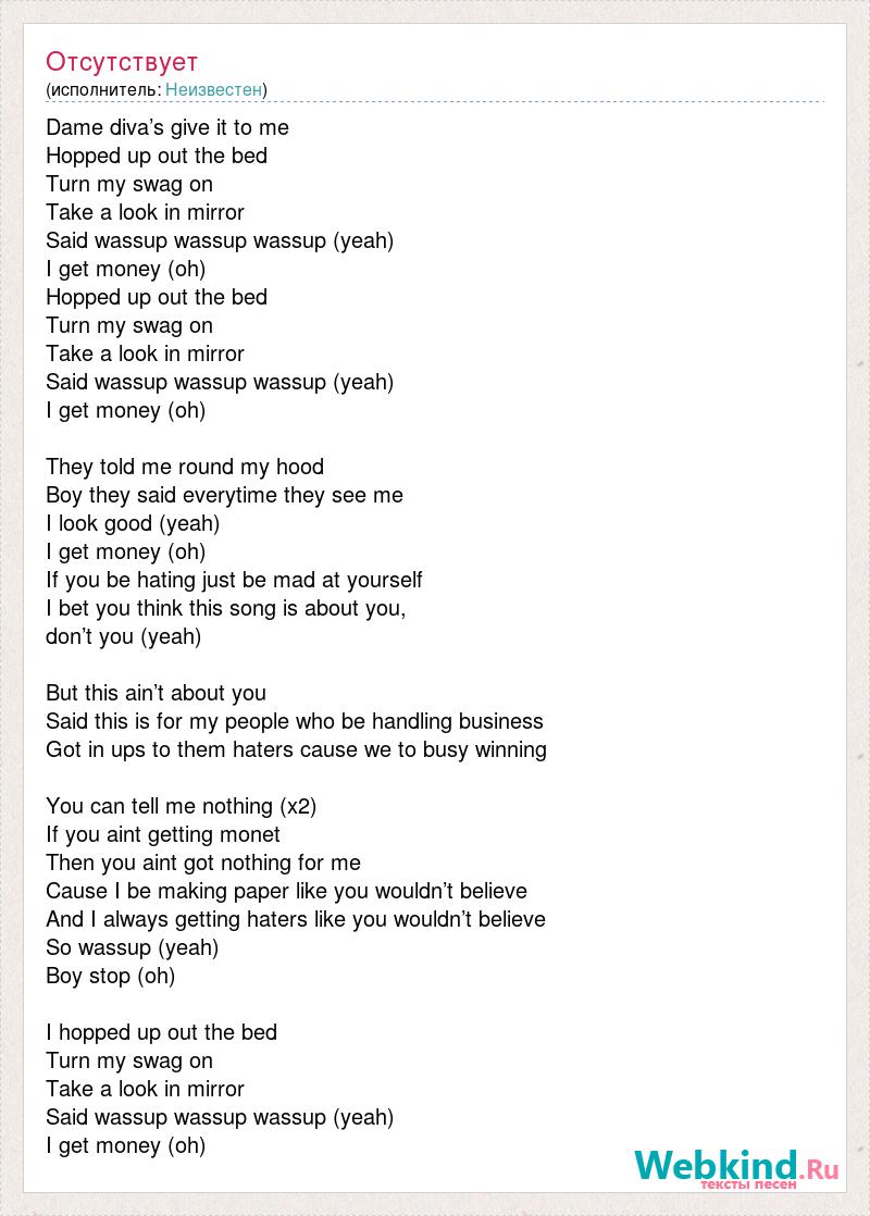 Dame diva’s give it to me Hopped up out the bed Turn my swag on Take a look in mirror Said wassup wassup wassup (yeah) I get money (oh) Hopped up out the bed Turn my swag on Take a look in mirror Said wassup wassup wassup (yeah) I get money (oh) They told me round my hood Boy they said everytime they see me I look good (yeah) I get money (oh) If you be hating just be mad at yourself I bet you think this song is about you, don’t you (yeah) But this ain’t about you Said this is for my people who be handling business Got in ups to them haters cause we to busy winning You can tell me nothing (x2) If you aint getting monet Then you aint got nothing for me Cause I be making paper like you wouldn’t believe And I always getting haters like you wouldn’t believe So wassup (yeah) Boy stop (oh) I hopped up out the bed Turn my swag on Take a look in mirror Said wassup wassup wassup (yeah) I get money (oh)