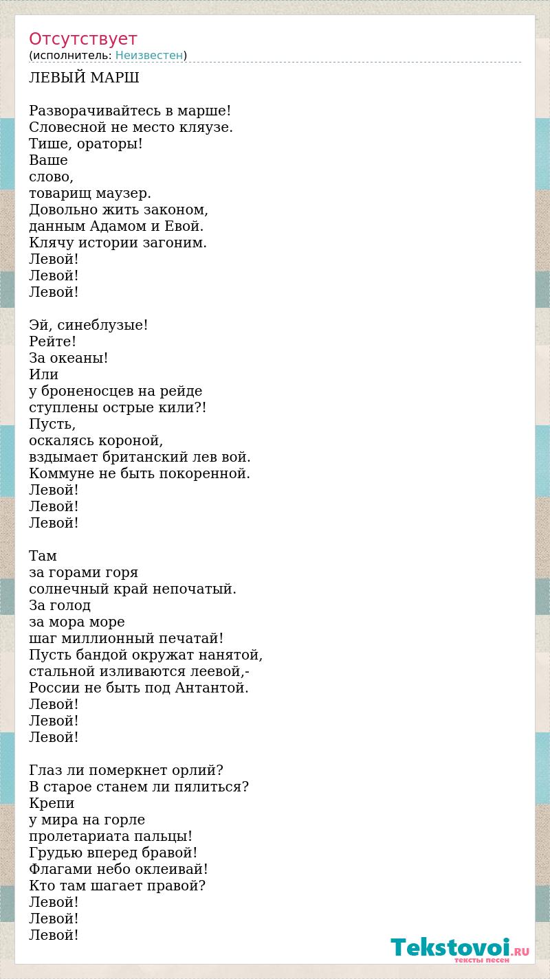 ЛЕВЫЙ МАРШ Разворачивайтесь в марше! Словесной не место кляузе. Тише, ораторы! Ваше слово, товарищ маузер. Довольно жить законом, данным Адамом и Евой. Клячу истории загоним. Левой! Левой! Левой! Эй, синеблузые! Рейте! За океаны! Или у броненосцев на рейде ступлены острые кили?! Пусть, оскалясь короной, вздымает британский лев вой. Коммуне не быть покоренной. Левой! Левой! Левой! Там за горами горя солнечный край непочатый. За голод за мора море шаг миллионный печатай! Пусть бандой окружат нанятой, стальной изливаются леевой,- России не быть под Антантой. Левой! Левой! Левой! Глаз ли померкнет орлий? В старое станем ли пялиться? Крепи у мира на горле пролетариата пальцы! Грудью вперед бравой! Флагами небо оклеивай! Кто там шагает правой? Левой! Левой! Левой!