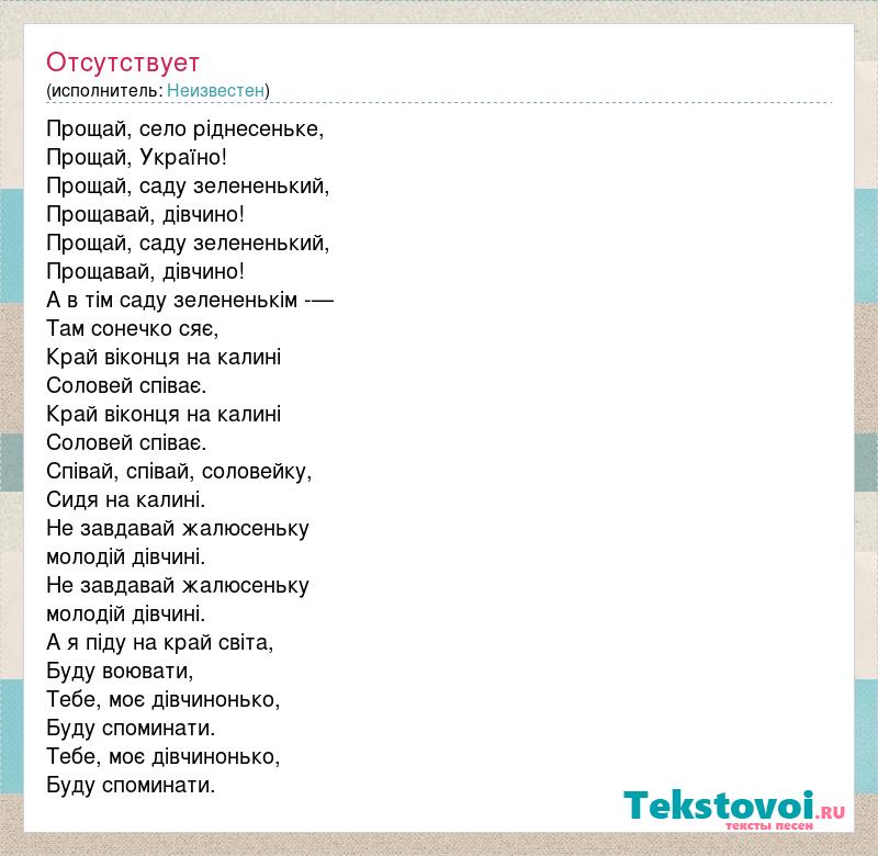 Прощай, село ріднесеньке, Прощай, Україно! Прощай, саду зелененький, Прощавай, дівчино! Прощай, саду зелененький, Прощавай, дівчино! А в тім саду зелененькім -— Там сонечко сяє, Край віконця на калині Соловей співає. Край віконця на калині Соловей співає. Співай, співай, соловейку, Сидя на калині. Не завдавай жалюсеньку молодій дівчині. Не завдавай жалюсеньку молодій дівчині. А я піду на край світа, Буду воювати, Тебе, моє дівчинонько, Буду споминати. Тебе, моє дівчинонько, Буду споминати.