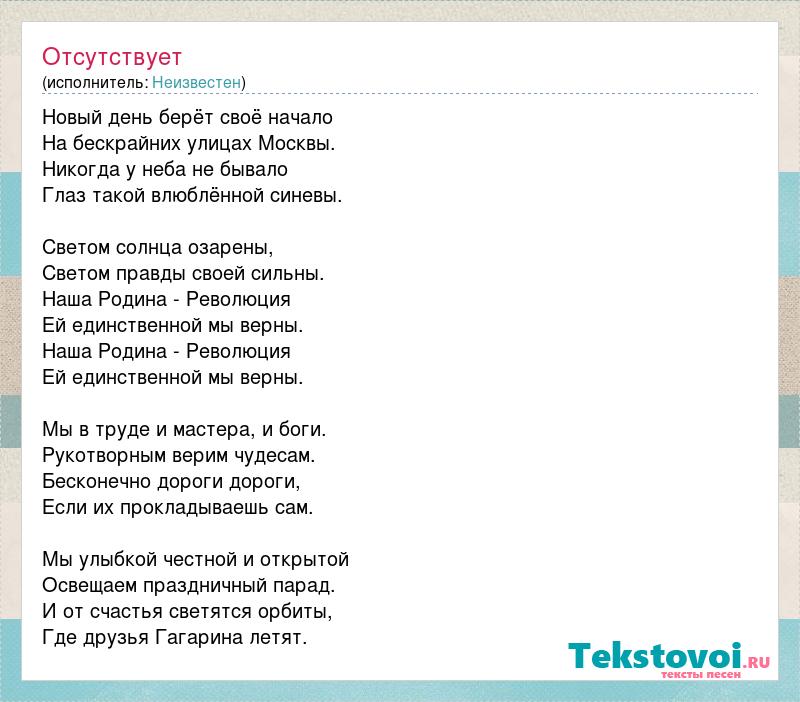 Новый день берёт своё начало На бескрайних улицах Москвы. Никогда у неба не бывало Глаз такой влюблённой синевы. Светом солнца озарены, Светом правды своей сильны. Наша Родина - Революция Ей единственной мы верны. Наша Родина - Революция Ей единственной мы верны. Мы в труде и мастера, и боги. Рукотворным верим чудесам. Бесконечно дороги дороги, Если их прокладываешь сам. Мы улыбкой честной и открытой Освещаем праздничный парад. И от счастья светятся орбиты, Где друзья Гагарина летят.